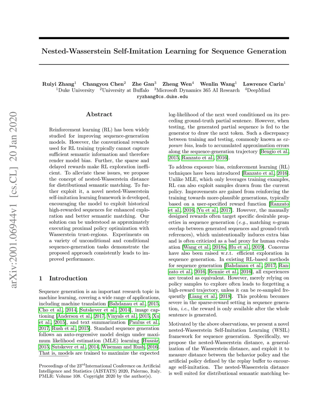 Nested-Wasserstein Self-Imitation Learning for Sequence Generation