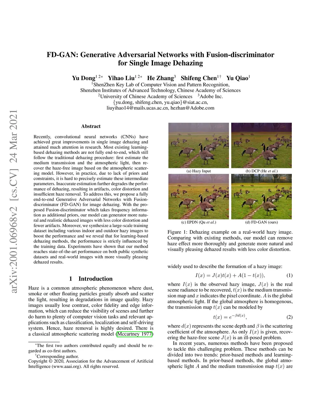 Recently, convolutional neural networks (CNNs) have achieved great improvements in single image dehazing and attained much attention in research. Most existing learning-based dehazing methods are not fully end-to-end, which still follow the traditional dehazing procedure: first estimate the medium transmission and the atmospheric light, then recover the haze-free image based on the atmospheric scattering model. However, in practice, due to lack of priors and constraints, it is hard to precisely estimate these intermediate parameters. Inaccurate estimation further degrades the performance of dehazing, resulting in artifacts, color distortion and insufficient haze removal. To address this, we propose a fully end-to-end Generative Adversarial Networks with Fusion-discriminator (FD-GAN) for image dehazing. With the proposed Fusion-discriminator which takes frequency information as additional priors, our model can generator more natural and realistic dehazed images with less color distortion and fewer artifacts. Moreover, we synthesize a large-scale training dataset including various indoor and outdoor hazy images to boost the performance and we reveal that for learning-based dehazing methods, the performance is strictly influenced by the training data. Experiments have shown that our method reaches state-of-the-art performance on both public synthetic datasets and real-world images with more visually pleasing dehazed results.