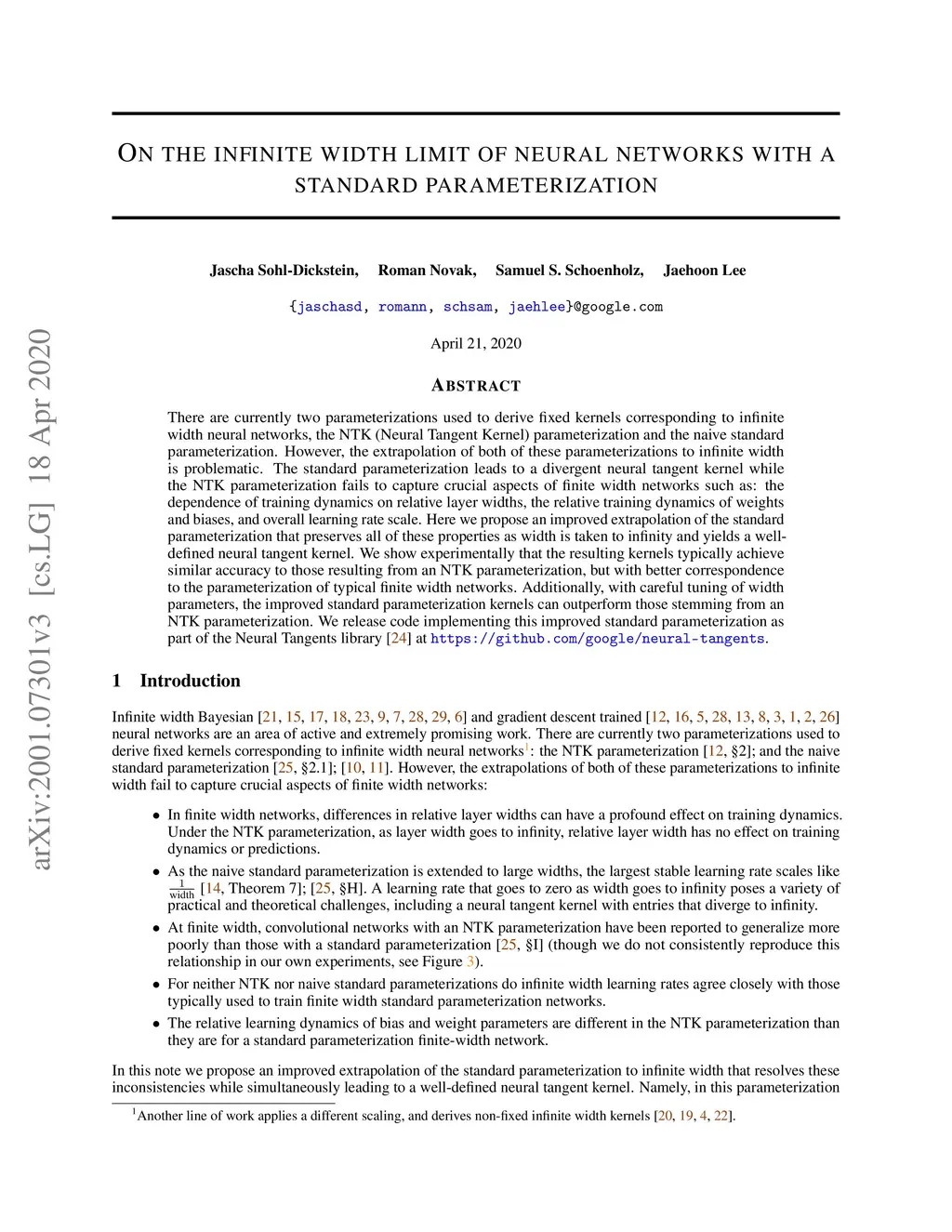 There are currently two parameterizations used to derive fixed kernels corresponding to infinite width neural networks, the NTK (Neural Tangent Kernel) parameterization and the naive standard parameterization. However, the extrapolation of both of these parameterizations to infinite width is problematic. The standard parameterization leads to a divergent neural tangent kernel while the NTK parameterization fails to capture crucial aspects of finite width networks such as: the dependence of training dynamics on relative layer widths, the relative training dynamics of weights and biases, and overall learning rate scale. Here we propose an improved extrapolation of the standard parameterization that preserves all of these properties as width is taken to infinity and yields a well-defined neural tangent kernel. We show experimentally that the resulting kernels typically achieve similar accuracy to those resulting from an NTK parameterization, but with better correspondence to the parameterization of typical finite width networks. Additionally, with careful tuning of width parameters, the improved standard parameterization kernels can outperform those stemming from an NTK parameterization. We release code implementing this improved standard parameterization as part of the Neural Tangents library at https://github.com/google/neural-tangents.