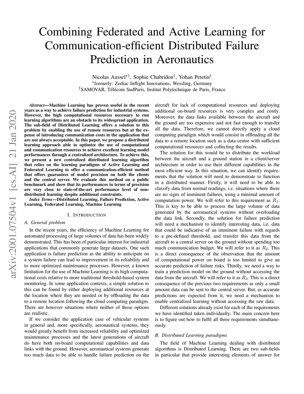 Machine Learning has proven useful in the recent years as a way to achieve failure prediction for industrial systems. However, the high computational resources necessary to run learning algorithms are an obstacle to its widespread application. The sub-field of Distributed Learning offers a solution to this problem by enabling the use of remote resources but at the expense of introducing communication costs in the application that are not always acceptable. In this paper, we propose a distributed learning approach able to optimize the use of computational and communication resources to achieve excellent learning model performances through a centralized architecture. To achieve this, we present a new centralized distributed learning algorithm that relies on the learning paradigms of Active Learning and Federated Learning to offer a communication-efficient method that offers guarantees of model precision on both the clients and the central server. We evaluate this method on a public benchmark and show that its performances in terms of precision are very close to state-of-the-art performance level of non-distributed learning despite additional constraints.