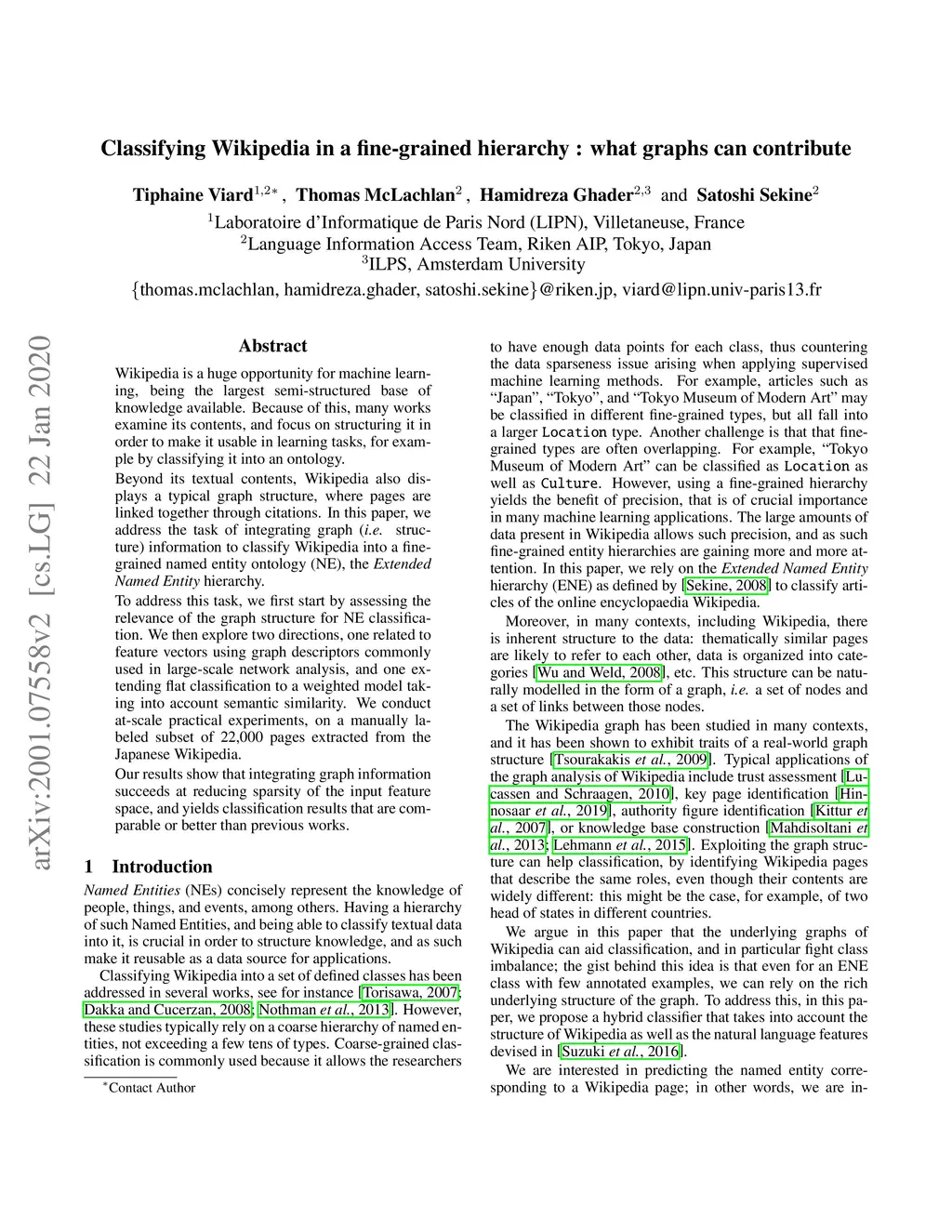Wikipedia is a huge opportunity for machine learning, being the largest semi-structured base of knowledge available. Because of this, many works examine its contents, and focus on structuring it in order to make it usable in learning tasks, for example by classifying it into an ontology. Beyond its textual contents, Wikipedia also displays a typical graph structure, where pages are linked together through citations. In this paper, we address the task of integrating graph (i.e. structure) information to classify Wikipedia into a fine-grained named entity ontology (NE), the Extended Named Entity hierarchy. To address this task, we first start by assessing the relevance of the graph structure for NE classification. We then explore two directions, one related to feature vectors using graph descriptors commonly used in large-scale network analysis, and one extending flat classification to a weighted model taking into account semantic similarity. We conduct at-scale practical experiments, on a manually labeled subset of 22,000 pages extracted from the Japanese Wikipedia. Our results show that integrating graph information succeeds at reducing sparsity of the input feature space, and yields classification results that are comparable or better than previous works.