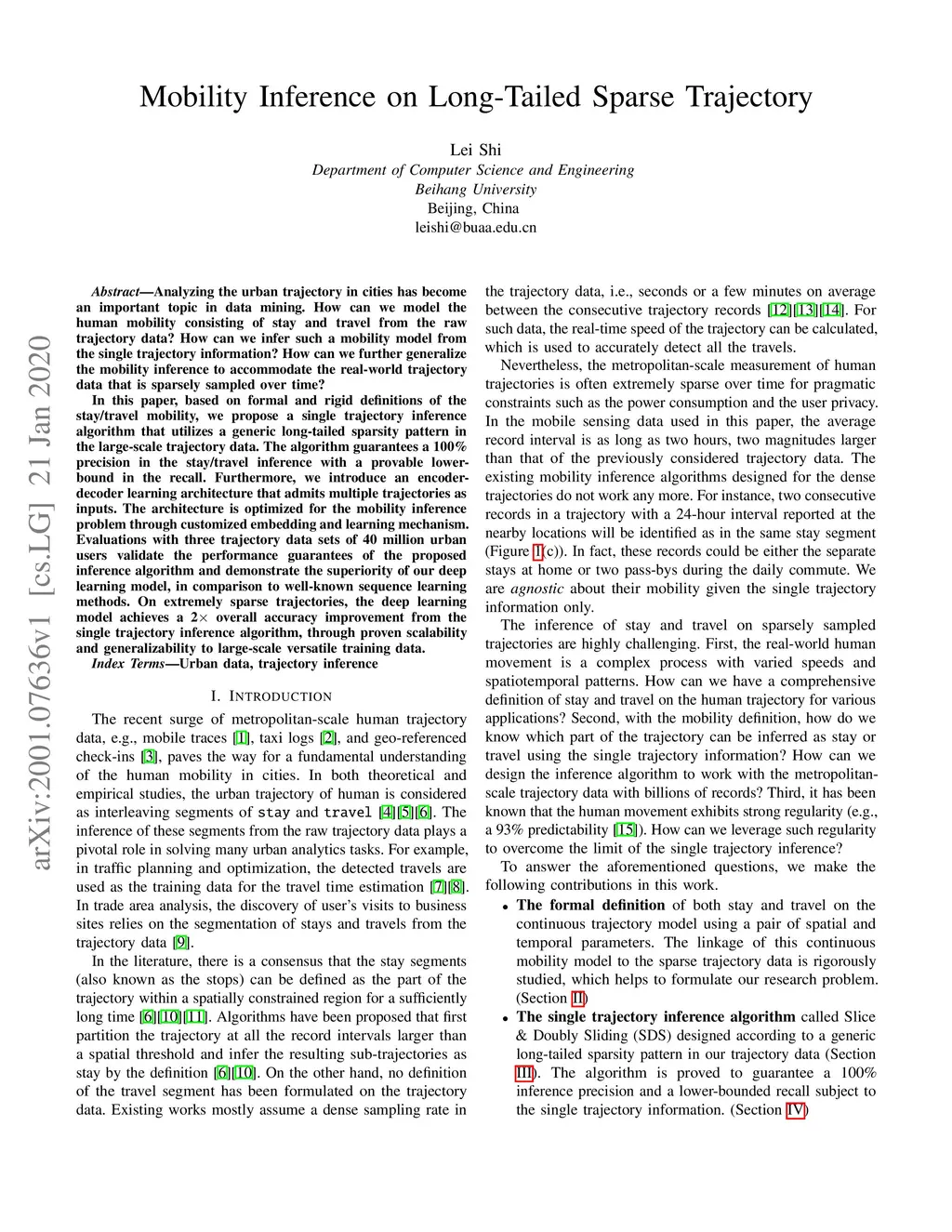Analyzing the urban trajectory in cities has become an important topic in data mining. How can we model the human mobility consisting of stay and travel from the raw trajectory data? How can we infer such a mobility model from the single trajectory information? How can we further generalize the mobility inference to accommodate the real-world trajectory data that is sparsely sampled over time? In this paper, based on formal and rigid definitions of the stay/travel mobility, we propose a single trajectory inference algorithm that utilizes a generic long-tailed sparsity pattern in the large-scale trajectory data. The algorithm guarantees a 100\% precision in the stay/travel inference with a provable lower-bound in the recall. Furthermore, we introduce an encoder-decoder learning architecture that admits multiple trajectories as inputs. The architecture is optimized for the mobility inference problem through customized embedding and learning mechanism. Evaluations with three trajectory data sets of 40 million urban users validate the performance guarantees of the proposed inference algorithm and demonstrate the superiority of our deep learning model, in comparison to well-known sequence learning methods. On extremely sparse trajectories, the deep learning model achieves a 2 overall accuracy improvement from the single trajectory inference algorithm, through proven scalability and generalizability to large-scale versatile training data.