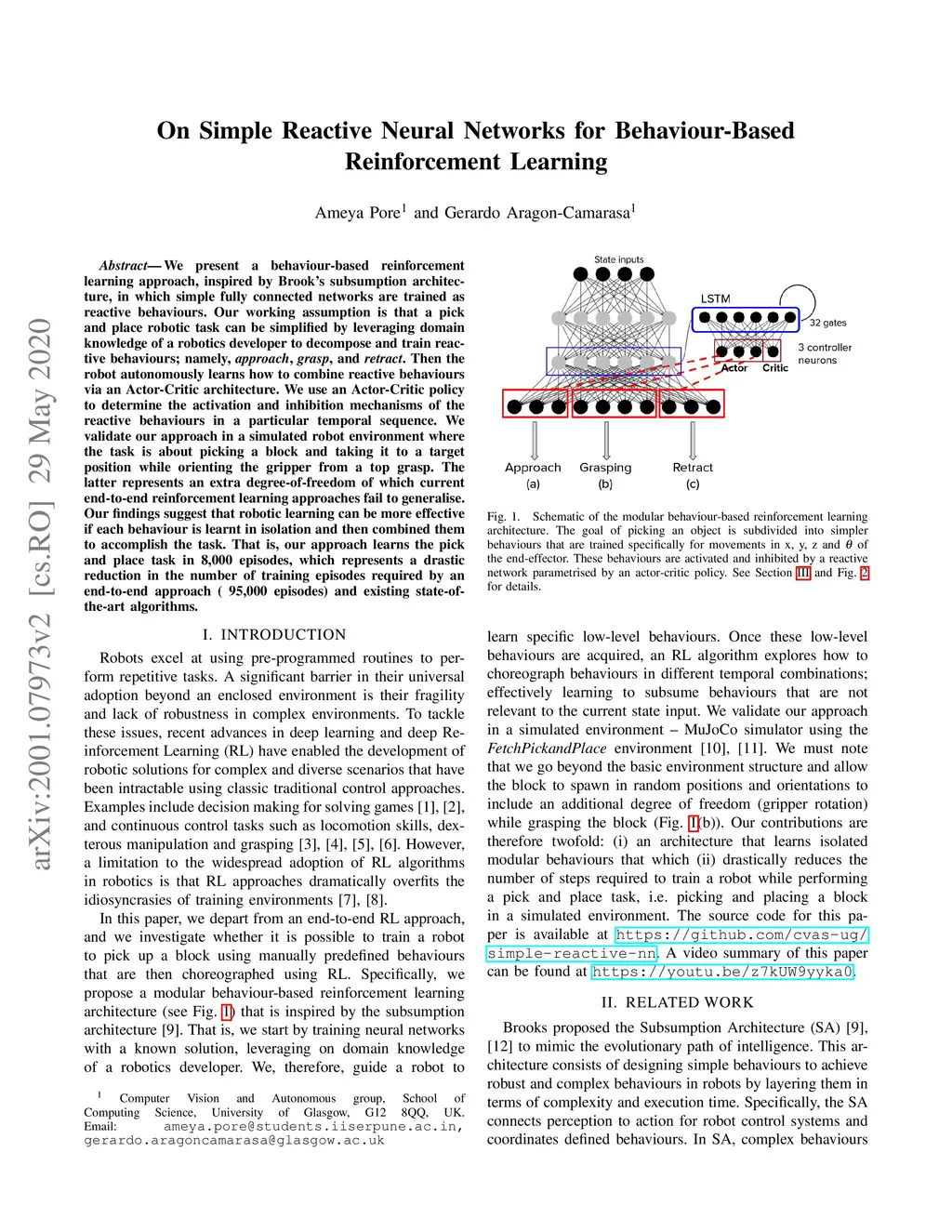 We present a behaviour-based reinforcement learning approach, inspired by Brook's subsumption architecture, in which simple fully connected networks are trained as reactive behaviours. Our working assumption is that a pick and place robotic task can be simplified by leveraging domain knowledge of a robotics developer to decompose and train such reactive behaviours; namely, approach, grasp, and retract. Then the robot autonomously learns how to combine them via an Actor-Critic architecture. The Actor-Critic policy is to determine the activation and inhibition mechanisms of the reactive behaviours in a particular temporal sequence. We validate our approach in a simulated robot environment where the task is picking a block and taking it to a target position while orienting the gripper from a top grasp. The latter represents an extra degree-of-freedom of which current end-to-end reinforcement learning fail to generalise. Our findings suggest that robotic learning can be more effective if each behaviour is learnt in isolation and then combined them to accomplish the task. That is, our approach learns the pick and place task in 8,000 episodes, which represents a drastic reduction in the number of training episodes required by an end-to-end approach and the existing state-of-the-art algorithms.