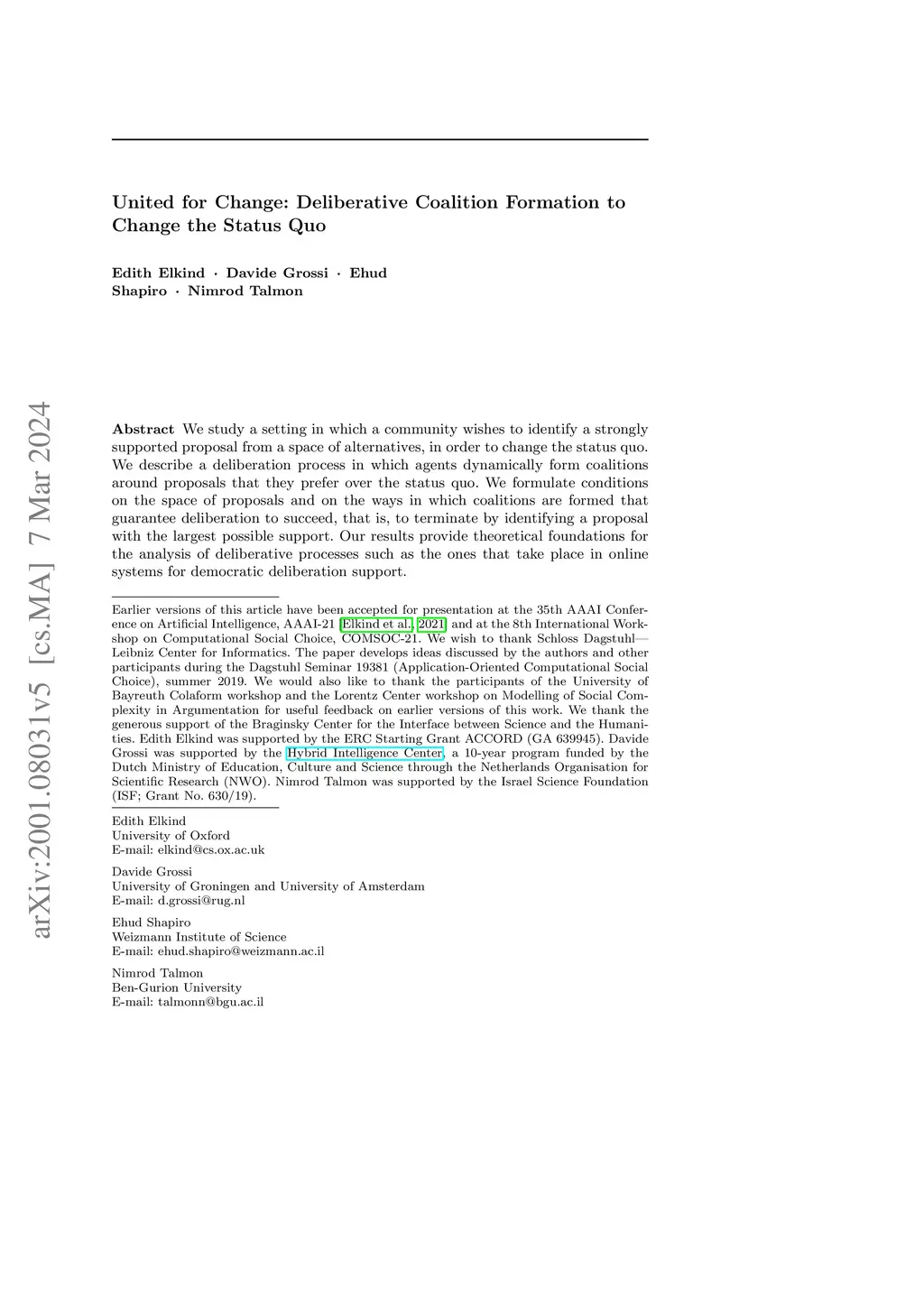 We study a setting in which a community wishes to identify a strongly supported proposal from a space of alternatives, in order to change the status quo. We describe a deliberation process in which agents dynamically form coalitions around proposals that they prefer over the status quo. We formulate conditions on the space of proposals and on the ways in which coalitions are formed that guarantee deliberation to succeed, that is, to terminate by identifying a proposal with the largest possible support. Our results provide theoretical foundations for the analysis of deliberative processes such as the ones that take place in online systems for democratic deliberation support.