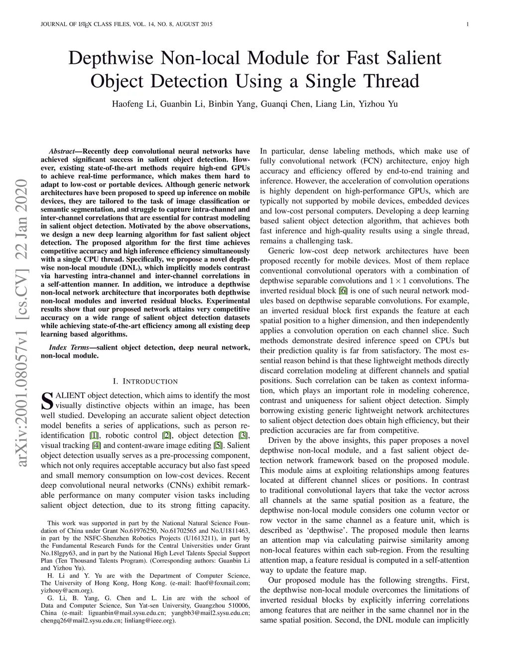 Depthwise Non-local Module for Fast Salient Object Detection Using a