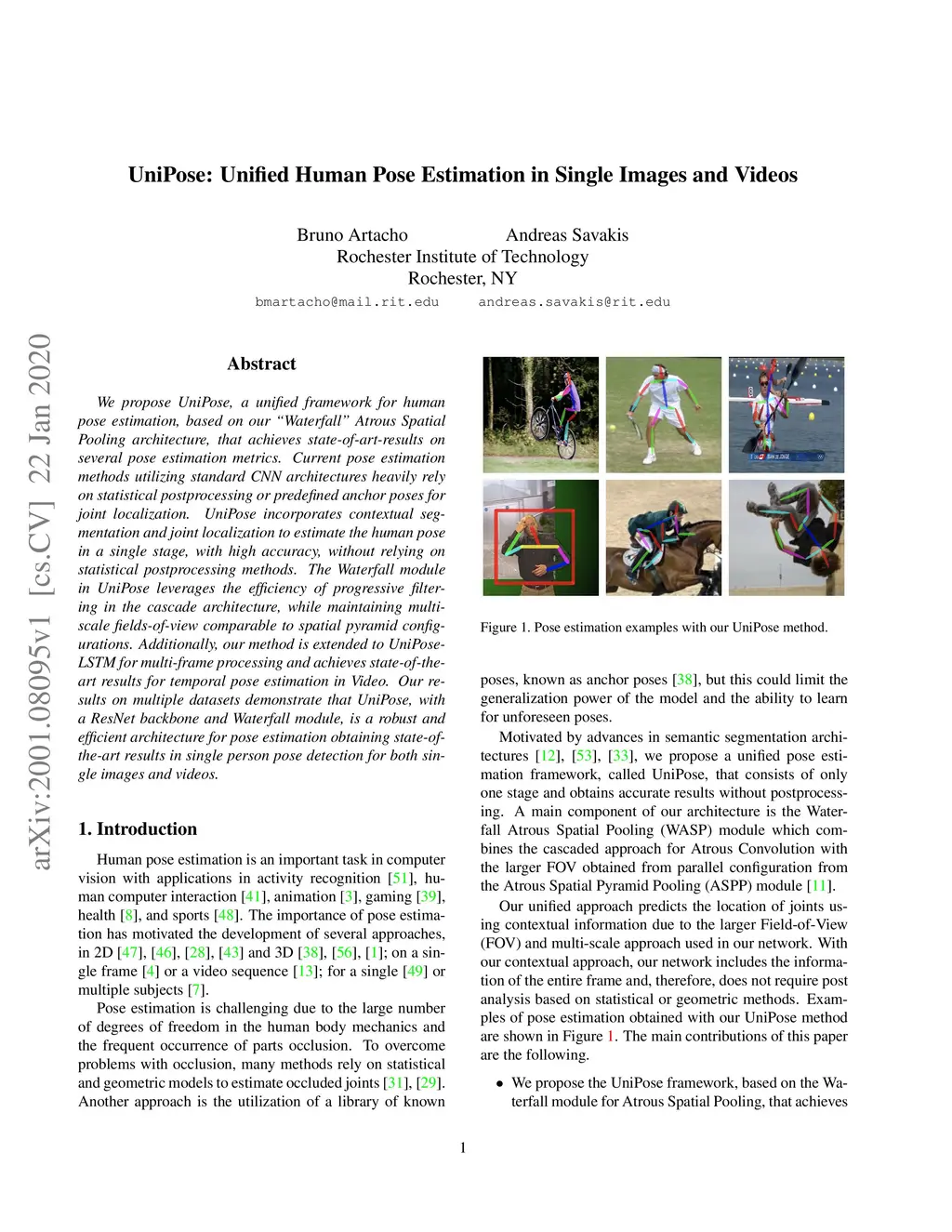 We propose UniPose, a unified framework for human pose estimation, based on our "Waterfall" Atrous Spatial Pooling architecture, that achieves state-of-art-results on several pose estimation metrics. Current pose estimation methods utilizing standard CNN architectures heavily rely on statistical postprocessing or predefined anchor poses for joint localization. UniPose incorporates contextual segmentation and joint localization to estimate the human pose in a single stage, with high accuracy, without relying on statistical postprocessing methods. The Waterfall module in UniPose leverages the efficiency of progressive filtering in the cascade architecture, while maintaining multi-scale fields-of-view comparable to spatial pyramid configurations. Additionally, our method is extended to UniPose-LSTM for multi-frame processing and achieves state-of-the-art results for temporal pose estimation in Video. Our results on multiple datasets demonstrate that UniPose, with a ResNet backbone and Waterfall module, is a robust and efficient architecture for pose estimation obtaining state-of-the-art results in single person pose detection for both single images and videos.