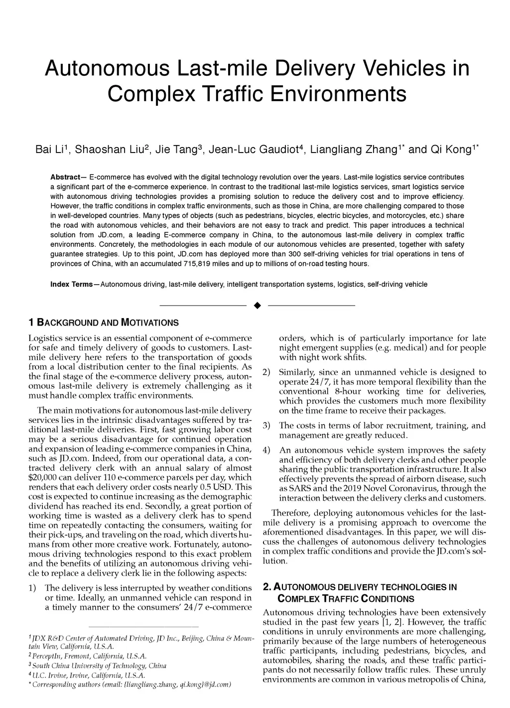 E-commerce has evolved with the digital technology revolution over the years. Last-mile logistics service contributes a significant part of the e-commerce experience. In contrast to the traditional last-mile logistics services, smart logistics service with autonomous driving technologies provides a promising solution to reduce the delivery cost and to improve efficiency. However, the traffic conditions in complex traffic environments, such as those in China, are more challenging compared to those in well-developed countries. Many types of moving objects (such as pedestrians, bicycles, electric bicycles, and motorcycles, etc.) share the road with autonomous vehicles, and their behaviors are not easy to track and predict. This paper introduces a technical solution from JD.com, a leading E-commerce company in China, to the autonomous last-mile delivery in complex traffic environments. Concretely, the methodologies in each module of our autonomous vehicles are presented, together with safety guarantee strategies. Up to this point, JD.com has deployed more than 300 self-driving vehicles for trial operations in tens of provinces of China, with an accumulated 715,819 miles and up to millions of on-road testing hours.