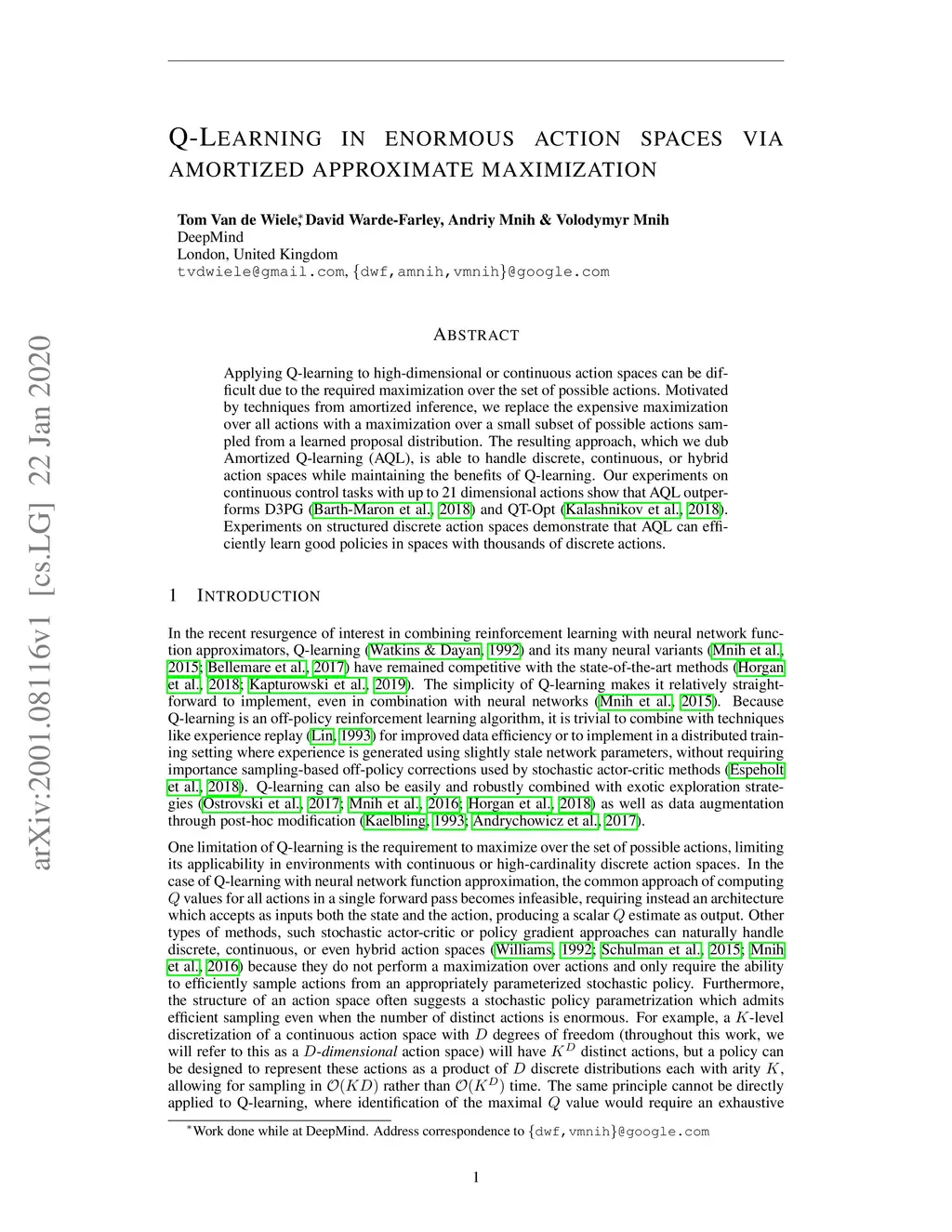 Applying Q-learning to high-dimensional or continuous action spaces can be difficult due to the required maximization over the set of possible actions. Motivated by techniques from amortized inference, we replace the expensive maximization over all actions with a maximization over a small subset of possible actions sampled from a learned proposal distribution. The resulting approach, which we dub Amortized Q-learning (AQL), is able to handle discrete, continuous, or hybrid action spaces while maintaining the benefits of Q-learning. Our experiments on continuous control tasks with up to 21 dimensional actions show that AQL outperforms D3PG (Barth-Maron et al, 2018) and QT-Opt (Kalashnikov et al, 2018). Experiments on structured discrete action spaces demonstrate that AQL can efficiently learn good policies in spaces with thousands of discrete actions.