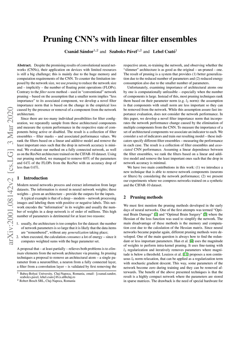 Despite the promising results of convolutional neural networks (CNNs), their application on devices with limited resources is still a big challenge; this is mainly due to the huge memory and computation requirements of the CNN. To counter the limitation imposed by the network size, we use pruning to reduce the network size and -- implicitly -- the number of floating point operations (FLOPs). Contrary to the filter norm method -- used in ``conventional`` network pruning -- based on the assumption that a smaller norm implies ``less importance'' to its associated component, we develop a novel filter importance norm that is based on the change in the empirical loss caused by the presence or removal of a component from the network architecture. Since there are too many individual possibilities for filter configuration, we repeatedly sample from these architectural components and measure the system performance in the respective state of components being active or disabled. The result is a collection of filter ensembles -- filter masks -- and associated performance values. We rank the filters based on a linear and additive model and remove the least important ones such that the drop in network accuracy is minimal. We evaluate our method on a fully connected network, as well as on the ResNet architecture trained on the CIFAR-10 dataset. Using our pruning method, we managed to remove of the parameters and of the FLOPs from the ResNet with an accuracy drop of less than .
