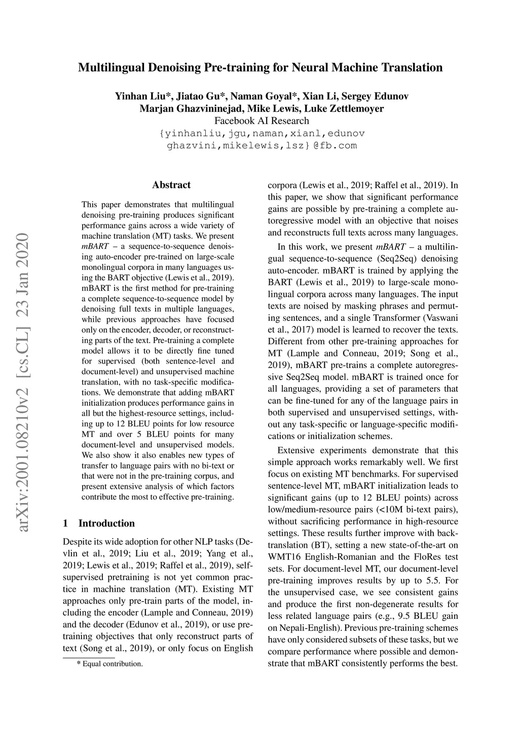 This paper demonstrates that multilingual denoising pre-training produces significant performance gains across a wide variety of machine translation (MT) tasks. We present mBART -- a sequence-to-sequence denoising auto-encoder pre-trained on large-scale monolingual corpora in many languages using the BART objective. mBART is one of the first methods for pre-training a complete sequence-to-sequence model by denoising full texts in multiple languages, while previous approaches have focused only on the encoder, decoder, or reconstructing parts of the text. Pre-training a complete model allows it to be directly fine tuned for supervised (both sentence-level and document-level) and unsupervised machine translation, with no task-specific modifications. We demonstrate that adding mBART initialization produces performance gains in all but the highest-resource settings, including up to 12 BLEU points for low resource MT and over 5 BLEU points for many document-level and unsupervised models. We also show it also enables new types of transfer to language pairs with no bi-text or that were not in the pre-training corpus, and present extensive analysis of which factors contribute the most to effective pre-training.