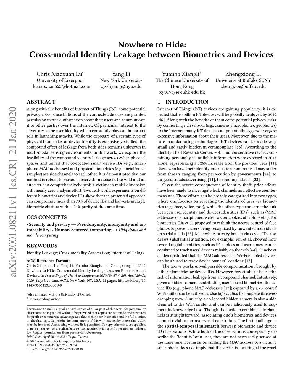 Along with the benefits of Internet of Things (IoT) come potential privacy risks, since billions of the connected devices are granted permission to track information about their users and communicate it to other parties over the Internet. Of particular interest to the adversary is the user identity which constantly plays an important role in launching attacks. While the exposure of a certain type of physical biometrics or device identity is extensively studied, the compound effect of leakage from both sides remains unknown in multi-modal sensing environments. In this work, we explore the feasibility of the compound identity leakage across cyber-physical spaces and unveil that co-located smart device IDs (e.g., smartphone MAC addresses) and physical biometrics (e.g., facial/vocal samples) are side channels to each other. It is demonstrated that our method is robust to various observation noise in the wild and an attacker can comprehensively profile victims in multi-dimension with nearly zero analysis effort. Two real-world experiments on different biometrics and device IDs show that the presented approach can compromise more than 70\% of device IDs and harvests multiple biometric clusters with ~94% purity at the same time.