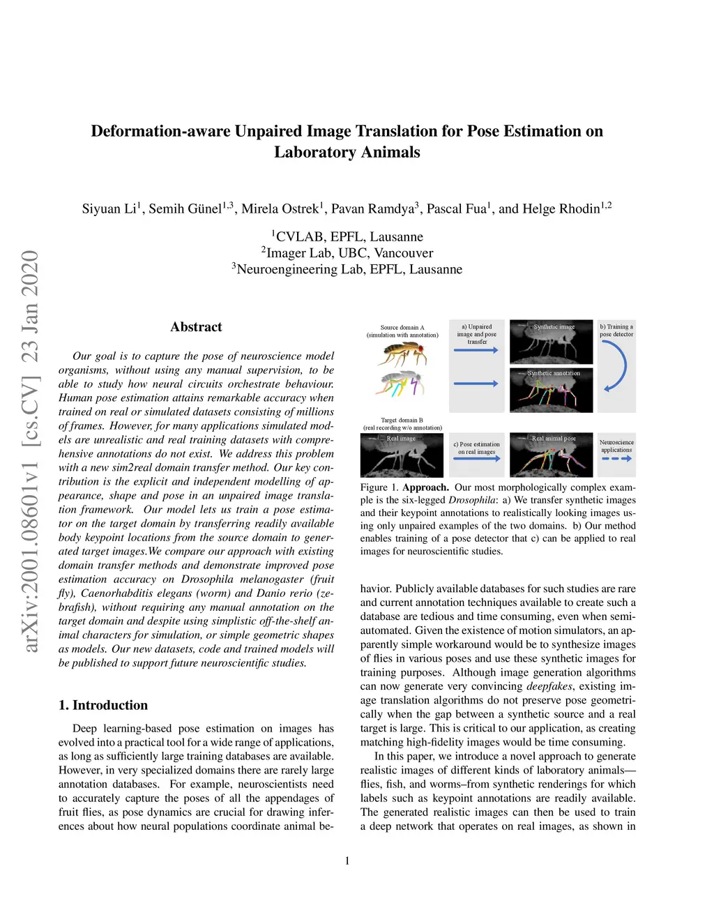 Our goal is to capture the pose of neuroscience model organisms, without using any manual supervision, to be able to study how neural circuits orchestrate behaviour. Human pose estimation attains remarkable accuracy when trained on real or simulated datasets consisting of millions of frames. However, for many applications simulated models are unrealistic and real training datasets with comprehensive annotations do not exist. We address this problem with a new sim2real domain transfer method. Our key contribution is the explicit and independent modeling of appearance, shape and poses in an unpaired image translation framework. Our model lets us train a pose estimator on the target domain by transferring readily available body keypoint locations from the source domain to generated target images. We compare our approach with existing domain transfer methods and demonstrate improved pose estimation accuracy on Drosophila melanogaster (fruit fly), Caenorhabditis elegans (worm) and Danio rerio (zebrafish), without requiring any manual annotation on the target domain and despite using simplistic off-the-shelf animal characters for simulation, or simple geometric shapes as models. Our new datasets, code, and trained models will be published to support future neuroscientific studies.