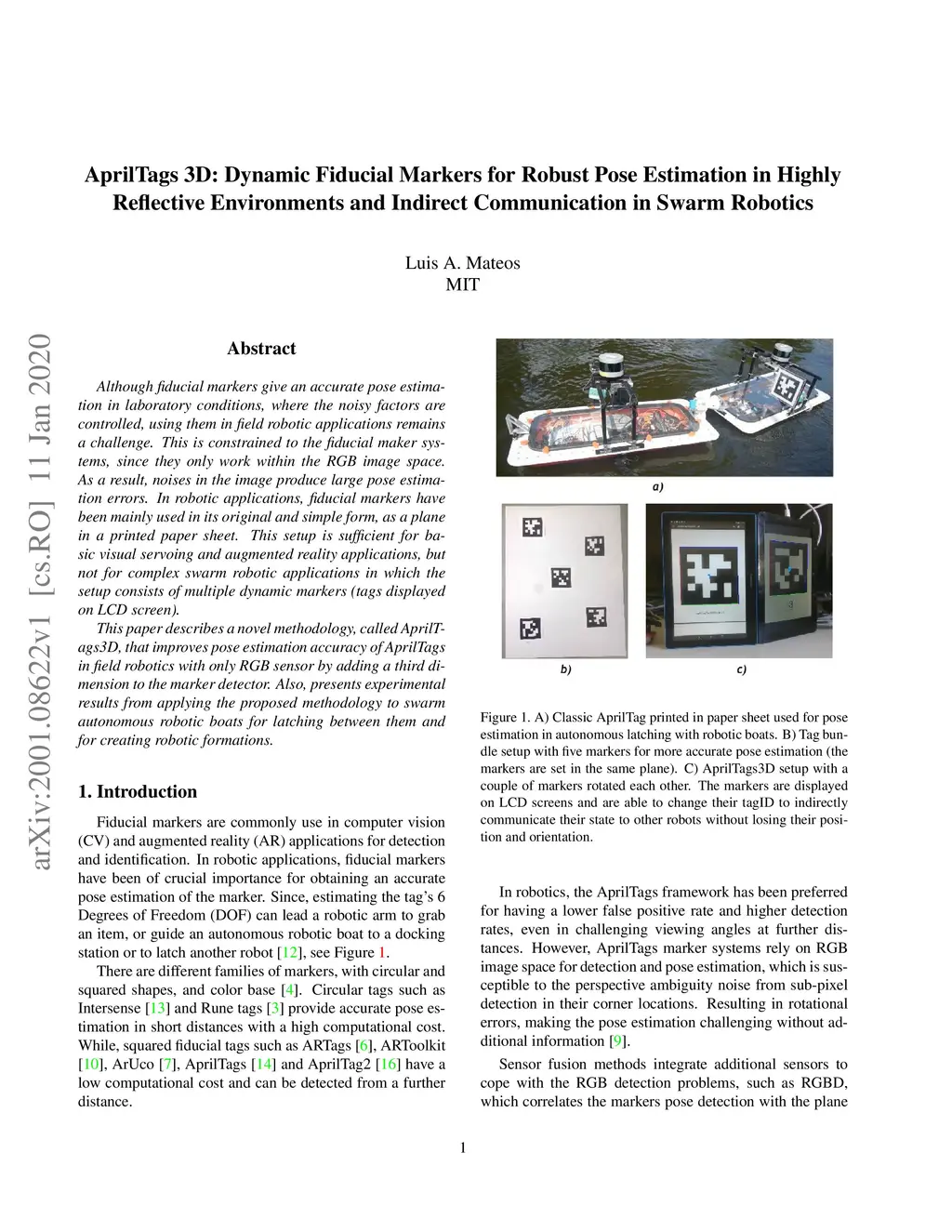 Although fiducial markers give an accurate pose estimation in laboratory conditions, where the noisy factors are controlled, using them in field robotic applications remains a challenge. This is constrained to the fiducial maker systems, since they only work within the RGB image space. As a result, noises in the image produce large pose estimation errors. In robotic applications, fiducial markers have been mainly used in its original and simple form, as a plane in a printed paper sheet. This setup is sufficient for basic visual servoing and augmented reality applications, but not for complex swarm robotic applications in which the setup consists of multiple dynamic markers (tags displayed on LCD screen). This paper describes a novel methodology, called AprilTags3D, that improves pose estimation accuracy of AprilTags in field robotics with only RGB sensor by adding a third dimension to the marker detector. Also, presents experimental results from applying the proposed methodology to swarm autonomous robotic boats for latching between them and for creating robotic formations.