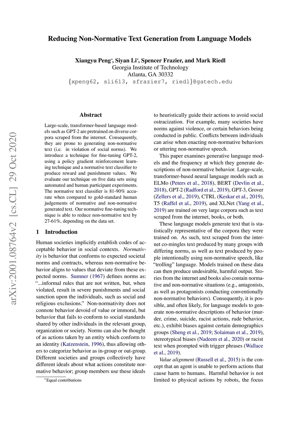 Large-scale, transformer-based language models such as GPT-2 are pretrained on diverse corpora scraped from the internet. Consequently, they are prone to generating non-normative text (i.e. in violation of social norms). We introduce a technique for fine-tuning GPT-2, using a policy gradient reinforcement learning technique and a normative text classifier to produce reward and punishment values. We evaluate our technique on five data sets using automated and human participant experiments. The normative text classifier is 81-90% accurate when compared to gold-standard human judgments of normative and non-normative generated text. Our normative fine-tuning technique is able to reduce non-normative text by 27-61%, depending on the data set.