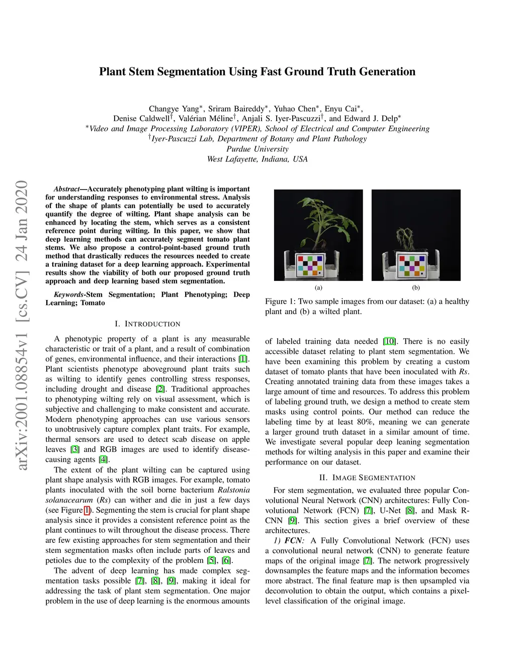 Accurately phenotyping plant wilting is important for understanding responses to environmental stress. Analysis of the shape of plants can potentially be used to accurately quantify the degree of wilting. Plant shape analysis can be enhanced by locating the stem, which serves as a consistent reference point during wilting. In this paper, we show that deep learning methods can accurately segment tomato plant stems. We also propose a control-point-based ground truth method that drastically reduces the resources needed to create a training dataset for a deep learning approach. Experimental results show the viability of both our proposed ground truth approach and deep learning based stem segmentation.