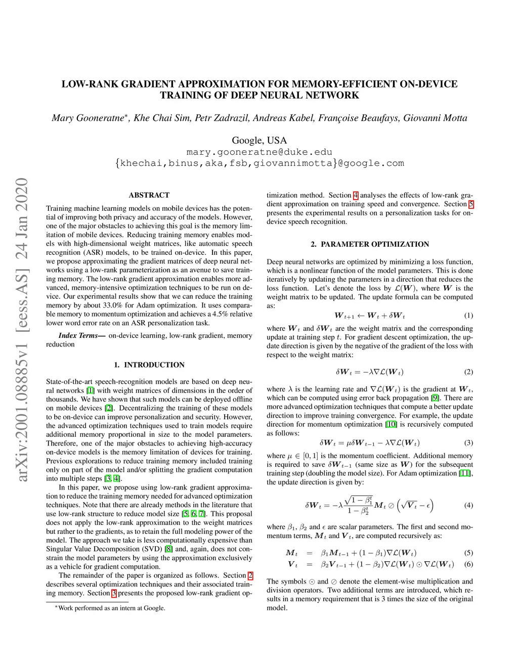 Training machine learning models on mobile devices has the potential of improving both privacy and accuracy of the models. However, one of the major obstacles to achieving this goal is the memory limitation of mobile devices. Reducing training memory enables models with high-dimensional weight matrices, like automatic speech recognition (ASR) models, to be trained on-device. In this paper, we propose approximating the gradient matrices of deep neural networks using a low-rank parameterization as an avenue to save training memory. The low-rank gradient approximation enables more advanced, memory-intensive optimization techniques to be run on device. Our experimental results show that we can reduce the training memory by about 33.0% for Adam optimization. It uses comparable memory to momentum optimization and achieves a 4.5% relative lower word error rate on an ASR personalization task.