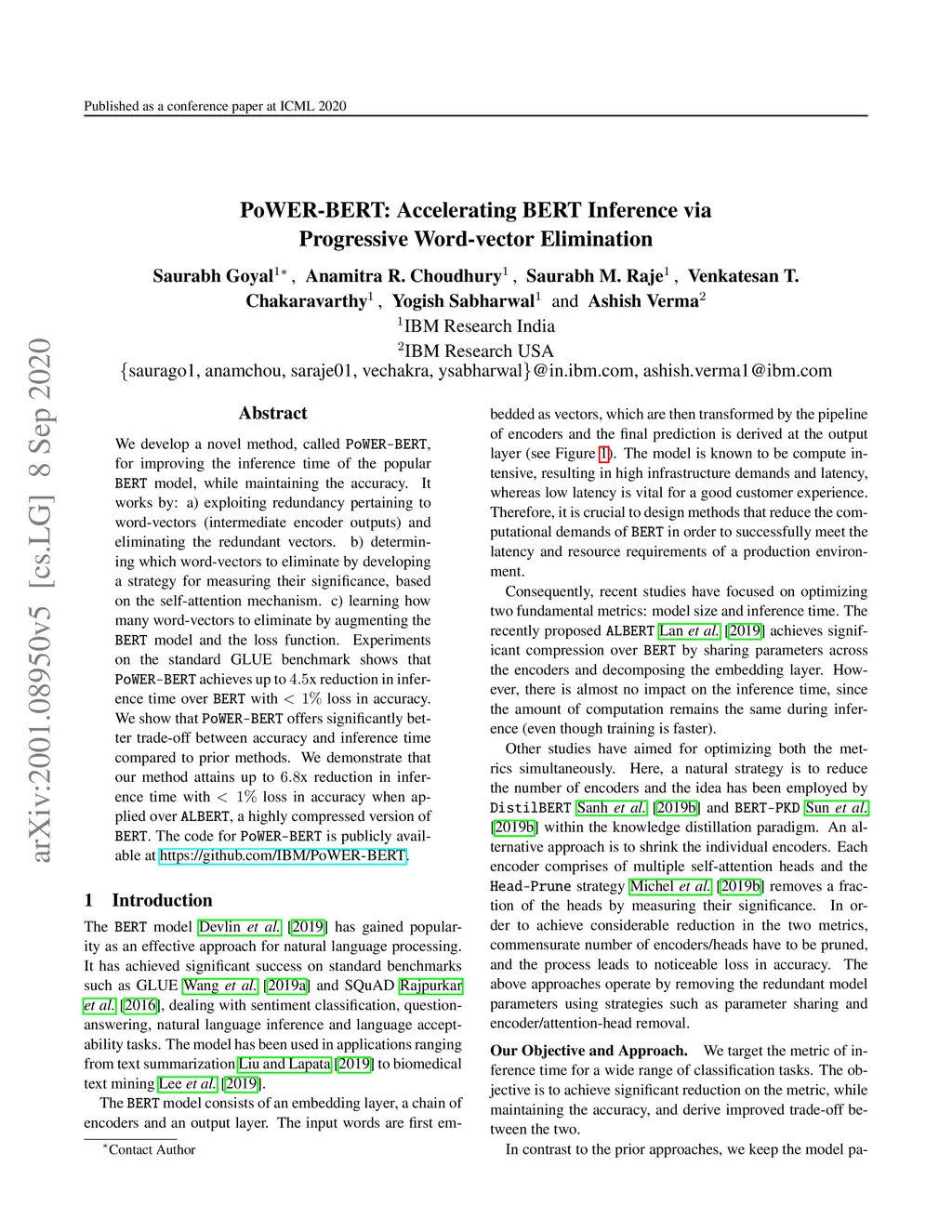 PoWER-BERT: Accelerating BERT Inference via Progressive Word-vector