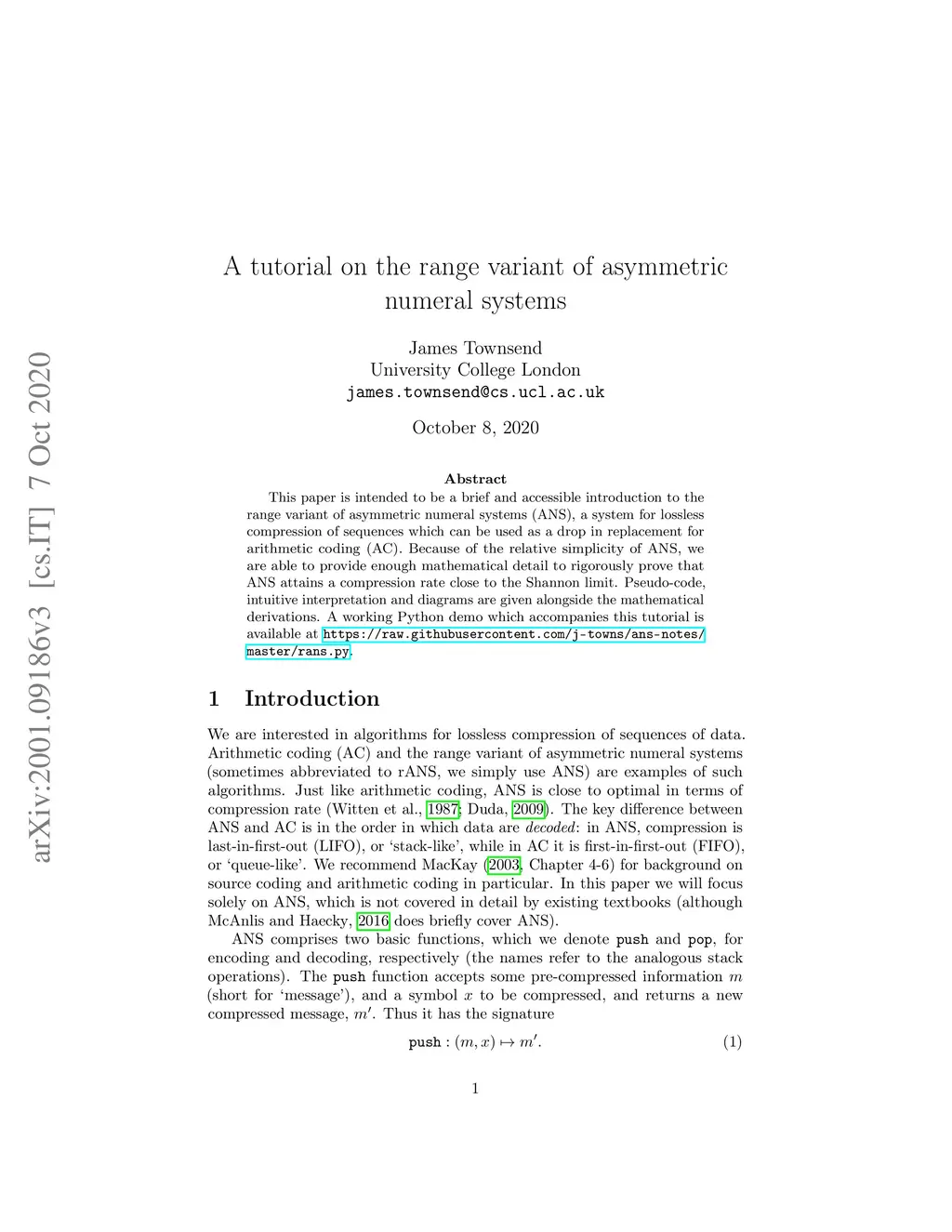 This paper is intended to be a brief and accessible introduction to the range variant of asymmetric numeral systems (ANS), a system for lossless compression of sequences which can be used as a drop in replacement for arithmetic coding (AC). Because of the relative simplicity of ANS, we are able to provide enough mathematical detail to rigorously prove that ANS attains a compression rate close to the Shannon limit. Pseudo-code, intuitive interpretation and diagrams are given alongside the mathematical derivations. A working Python demo which accompanies this tutorial is available at https://raw.githubusercontent.com/j-towns/ans-notes/master/rans.py.
