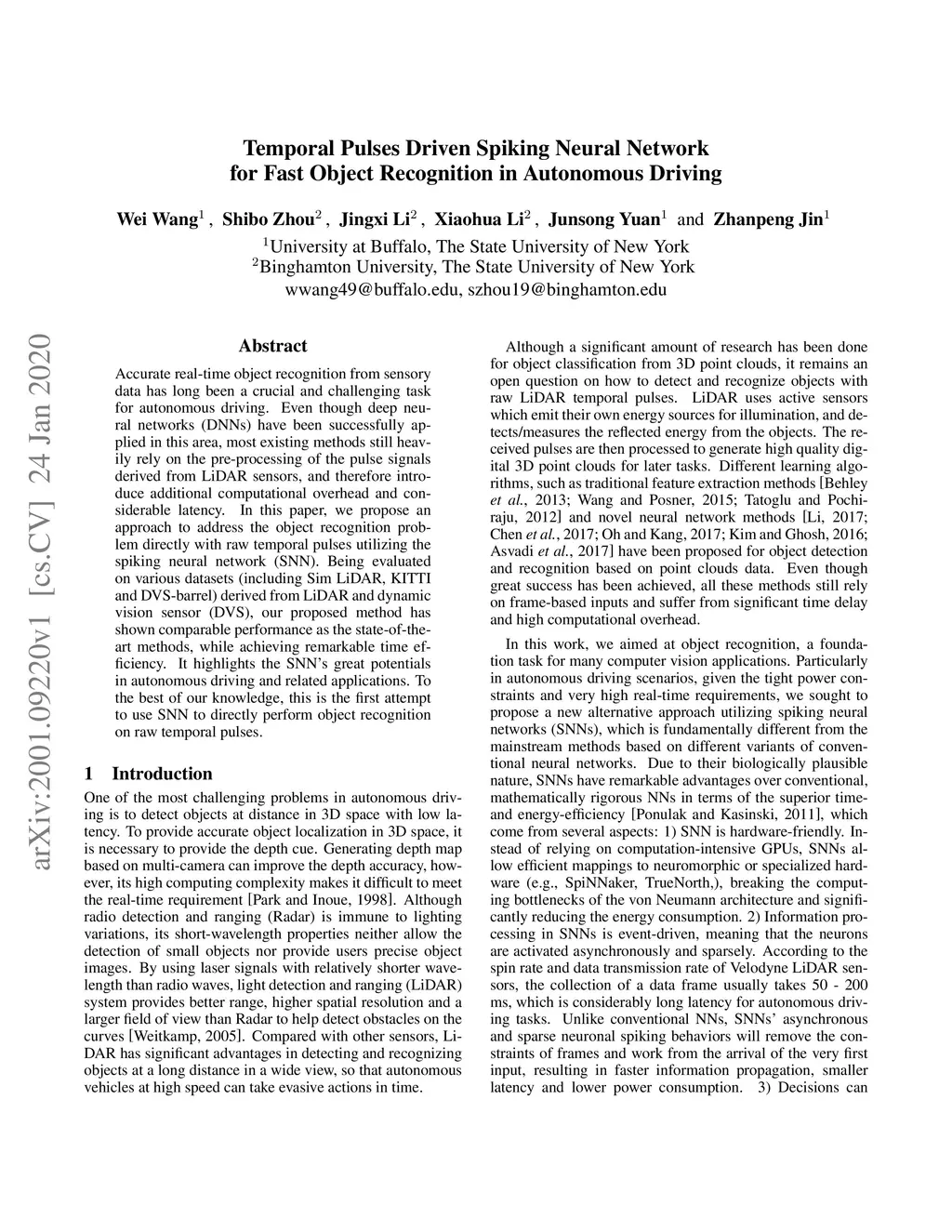 Accurate real-time object recognition from sensory data has long been a crucial and challenging task for autonomous driving. Even though deep neural networks (DNNs) have been successfully applied in this area, most existing methods still heavily rely on the pre-processing of the pulse signals derived from LiDAR sensors, and therefore introduce additional computational overhead and considerable latency. In this paper, we propose an approach to address the object recognition problem directly with raw temporal pulses utilizing the spiking neural network (SNN). Being evaluated on various datasets (including Sim LiDAR, KITTI and DVS-barrel) derived from LiDAR and dynamic vision sensor (DVS), our proposed method has shown comparable performance as the state-of-the-art methods, while achieving remarkable time efficiency. It highlights the SNN's great potentials in autonomous driving and related applications. To the best of our knowledge, this is the first attempt to use SNN to directly perform object recognition on raw temporal pulses.
