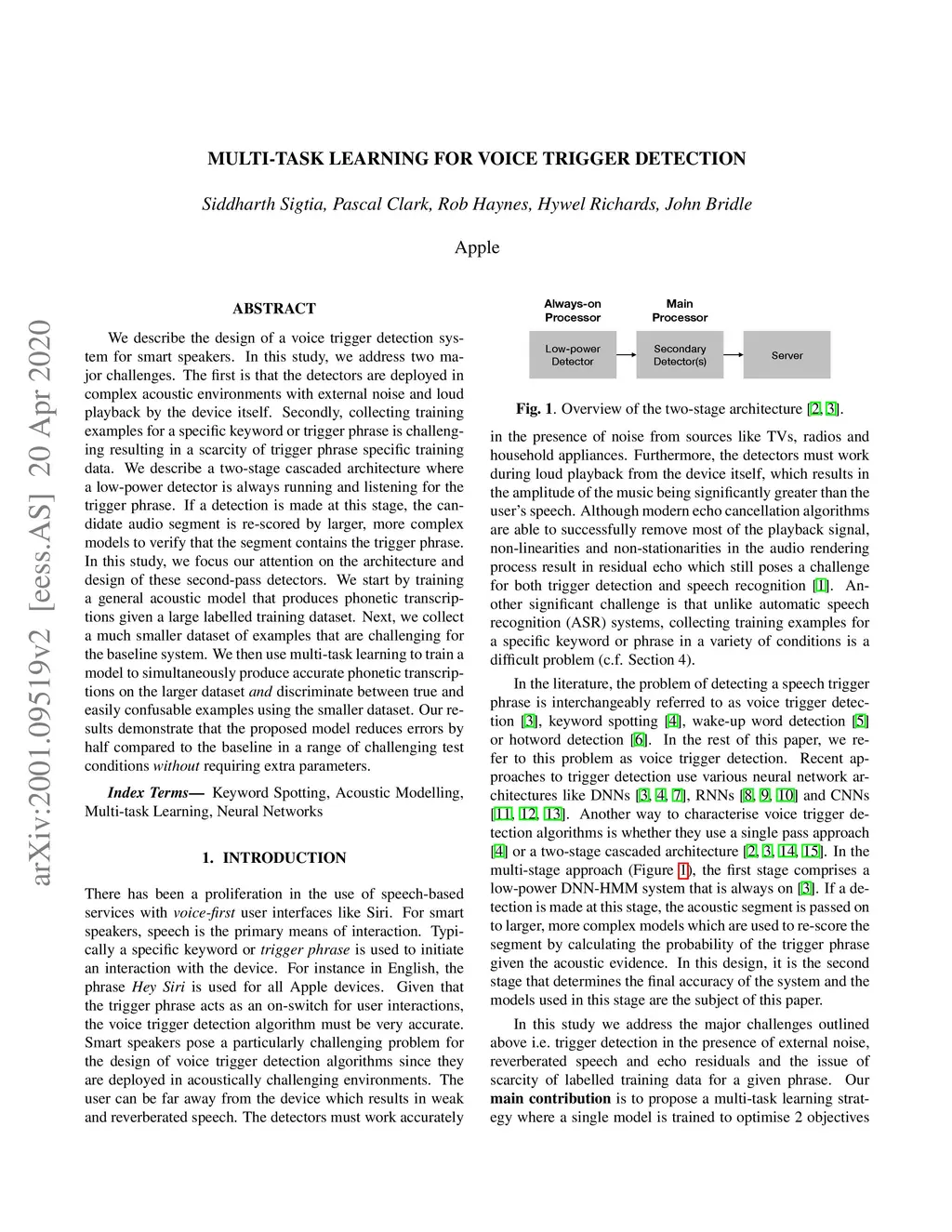 We describe the design of a voice trigger detection system for smart speakers. In this study, we address two major challenges. The first is that the detectors are deployed in complex acoustic environments with external noise and loud playback by the device itself. Secondly, collecting training examples for a specific keyword or trigger phrase is challenging resulting in a scarcity of trigger phrase specific training data. We describe a two-stage cascaded architecture where a low-power detector is always running and listening for the trigger phrase. If a detection is made at this stage, the candidate audio segment is re-scored by larger, more complex models to verify that the segment contains the trigger phrase. In this study, we focus our attention on the architecture and design of these second-pass detectors. We start by training a general acoustic model that produces phonetic transcriptions given a large labelled training dataset. Next, we collect a much smaller dataset of examples that are challenging for the baseline system. We then use multi-task learning to train a model to simultaneously produce accurate phonetic transcriptions on the larger dataset \emph{and} discriminate between true and easily confusable examples using the smaller dataset. Our results demonstrate that the proposed model reduces errors by half compared to the baseline in a range of challenging test conditions \emph{without} requiring extra parameters.