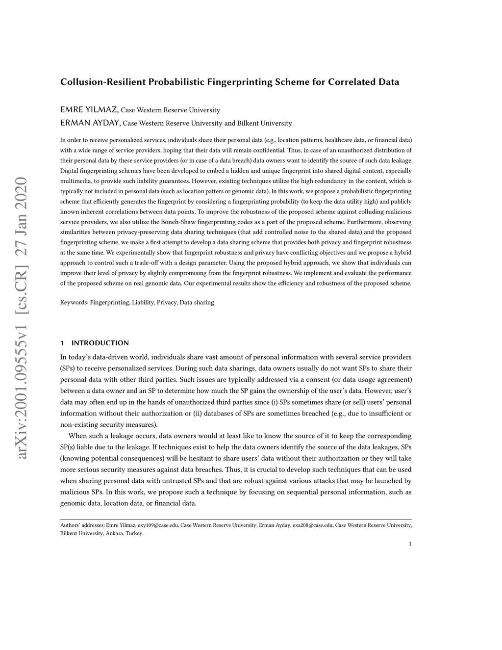 In order to receive personalized services, individuals share their personal data with a wide range of service providers, hoping that their data will remain confidential. Thus, in case of an unauthorized distribution of their personal data by these service providers (or in case of a data breach) data owners want to identify the source of such data leakage. Digital fingerprinting schemes have been developed to embed a hidden and unique fingerprint into shared digital content, especially multimedia, to provide such liability guarantees. However, existing techniques utilize the high redundancy in the content, which is typically not included in personal data. In this work, we propose a probabilistic fingerprinting scheme that efficiently generates the fingerprint by considering a fingerprinting probability (to keep the data utility high) and publicly known inherent correlations between data points. To improve the robustness of the proposed scheme against colluding malicious service providers, we also utilize the Boneh-Shaw fingerprinting codes as a part of the proposed scheme. Furthermore, observing similarities between privacy-preserving data sharing techniques (that add controlled noise to the shared data) and the proposed fingerprinting scheme, we make a first attempt to develop a data sharing scheme that provides both privacy and fingerprint robustness at the same time. We experimentally show that fingerprint robustness and privacy have conflicting objectives and we propose a hybrid approach to control such a trade-off with a design parameter. Using the proposed hybrid approach, we show that individuals can improve their level of privacy by slightly compromising from the fingerprint robustness. We implement and evaluate the performance of the proposed scheme on real genomic data. Our experimental results show the efficiency and robustness of the proposed scheme.