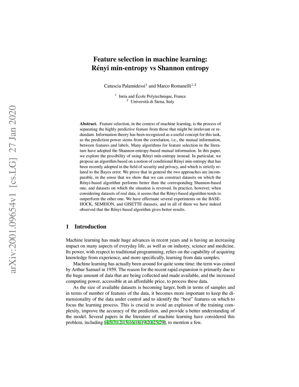 Feature selection in machine learning: Rényi min-entropy vs Shannon
