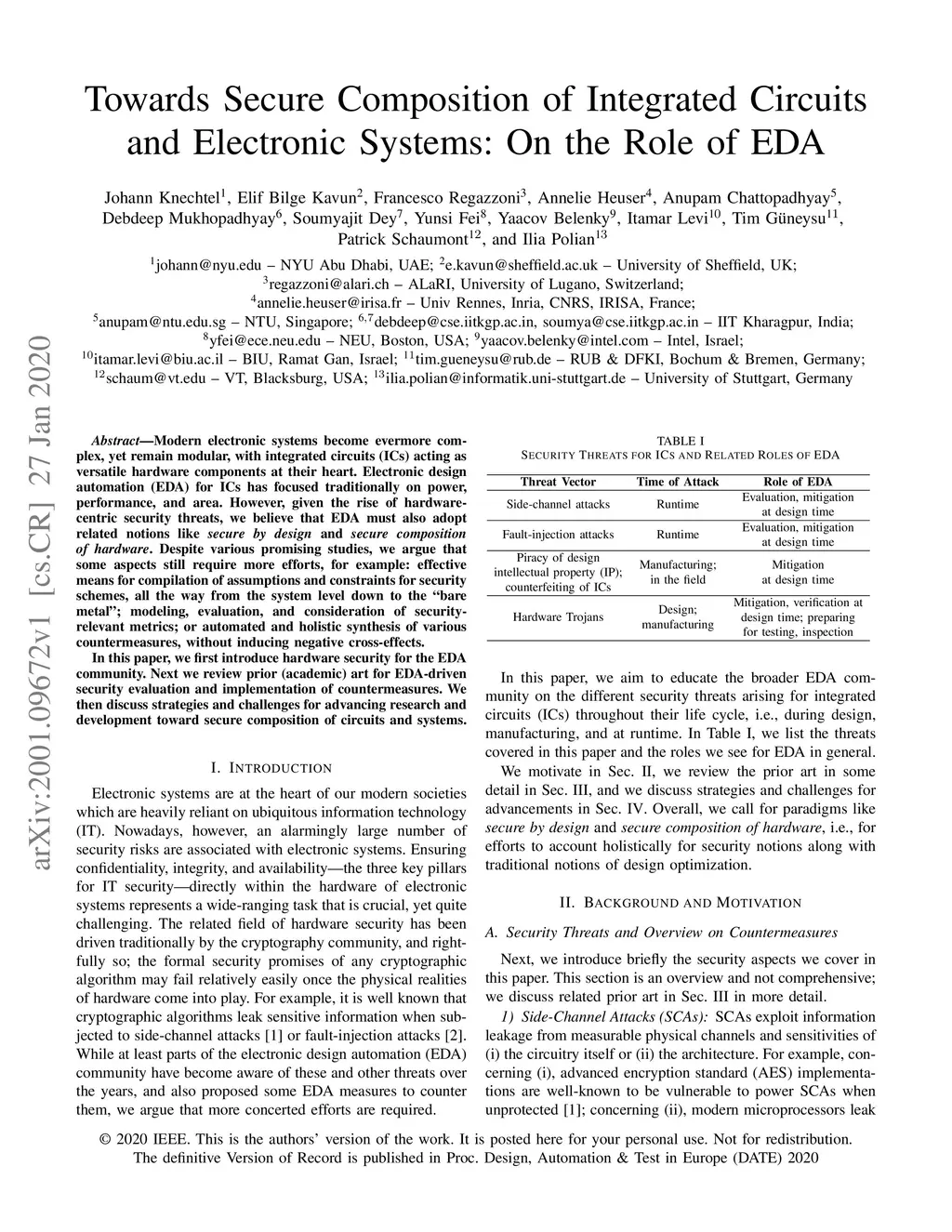 Modern electronic systems become evermore complex, yet remain modular, with integrated circuits (ICs) acting as versatile hardware components at their heart. Electronic design automation (EDA) for ICs has focused traditionally on power, performance, and area. However, given the rise of hardware-centric security threats, we believe that EDA must also adopt related notions like secure by design and secure composition of hardware. Despite various promising studies, we argue that some aspects still require more efforts, for example: effective means for compilation of assumptions and constraints for security schemes, all the way from the system level down to the "bare metal"; modeling, evaluation, and consideration of security-relevant metrics; or automated and holistic synthesis of various countermeasures, without inducing negative cross-effects. In this paper, we first introduce hardware security for the EDA community. Next we review prior (academic) art for EDA-driven security evaluation and implementation of countermeasures. We then discuss strategies and challenges for advancing research and development toward secure composition of circuits and systems.