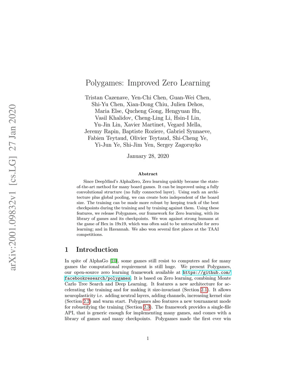 Since DeepMind's AlphaZero, Zero learning quickly became the state-of-the-art method for many board games. It can be improved using a fully convolutional structure (no fully connected layer). Using such an architecture plus global pooling, we can create bots independent of the board size. The training can be made more robust by keeping track of the best checkpoints during the training and by training against them. Using these features, we release Polygames, our framework for Zero learning, with its library of games and its checkpoints. We won against strong humans at the game of Hex in 19x19, which was often said to be untractable for zero learning; and in Havannah. We also won several first places at the TAAI competitions.