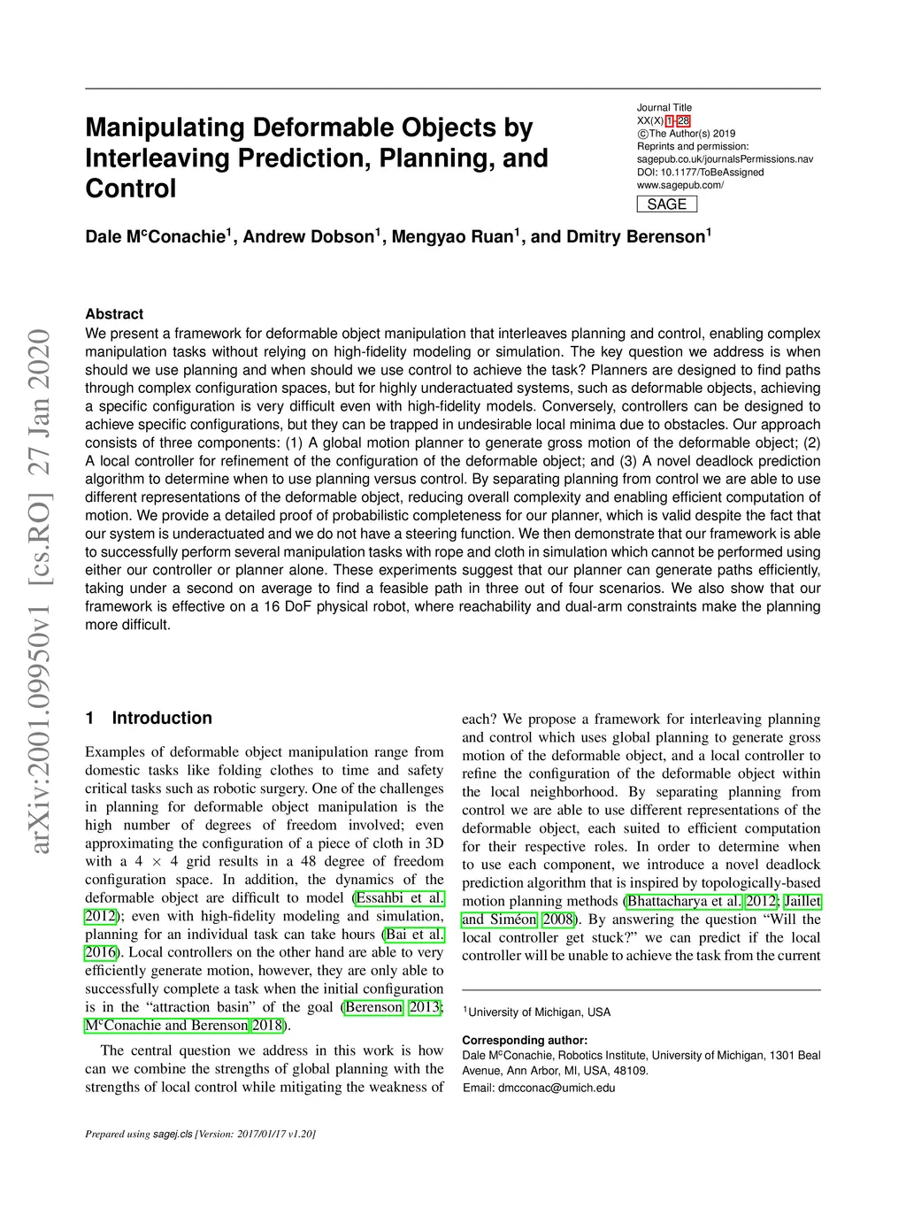 We present a framework for deformable object manipulation that interleaves planning and control, enabling complex manipulation tasks without relying on high-fidelity modeling or simulation. The key question we address is when should we use planning and when should we use control to achieve the task? Planners are designed to find paths through complex configuration spaces, but for highly underactuated systems, such as deformable objects, achieving a specific configuration is very difficult even with high-fidelity models. Conversely, controllers can be designed to achieve specific configurations, but they can be trapped in undesirable local minima due to obstacles. Our approach consists of three components: (1) A global motion planner to generate gross motion of the deformable object; (2) A local controller for refinement of the configuration of the deformable object; and (3) A novel deadlock prediction algorithm to determine when to use planning versus control. By separating planning from control we are able to use different representations of the deformable object, reducing overall complexity and enabling efficient computation of motion. We provide a detailed proof of probabilistic completeness for our planner, which is valid despite the fact that our system is underactuated and we do not have a steering function. We then demonstrate that our framework is able to successfully perform several manipulation tasks with rope and cloth in simulation which cannot be performed using either our controller or planner alone. These experiments suggest that our planner can generate paths efficiently, taking under a second on average to find a feasible path in three out of four scenarios. We also show that our framework is effective on a 16 DoF physical robot, where reachability and dual-arm constraints make the planning more difficult.