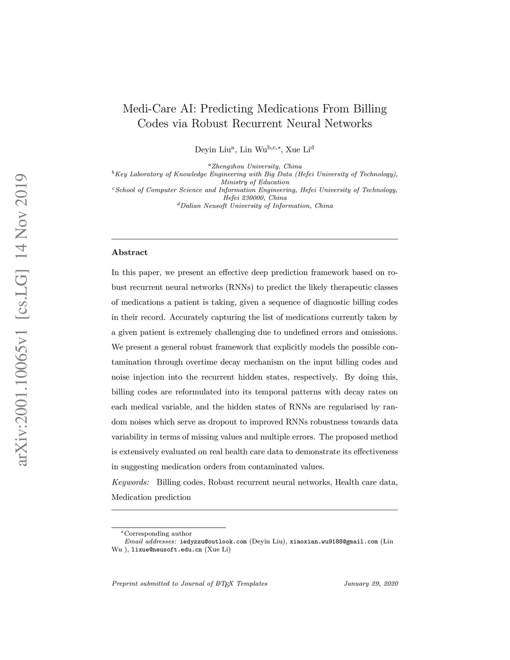 In this paper, we present an effective deep prediction framework based on robust recurrent neural networks (RNNs) to predict the likely therapeutic classes of medications a patient is taking, given a sequence of diagnostic billing codes in their record. Accurately capturing the list of medications currently taken by a given patient is extremely challenging due to undefined errors and omissions. We present a general robust framework that explicitly models the possible contamination through overtime decay mechanism on the input billing codes and noise injection into the recurrent hidden states, respectively. By doing this, billing codes are reformulated into its temporal patterns with decay rates on each medical variable, and the hidden states of RNNs are regularised by random noises which serve as dropout to improved RNNs robustness towards data variability in terms of missing values and multiple errors. The proposed method is extensively evaluated on real health care data to demonstrate its effectiveness in suggesting medication orders from contaminated values.