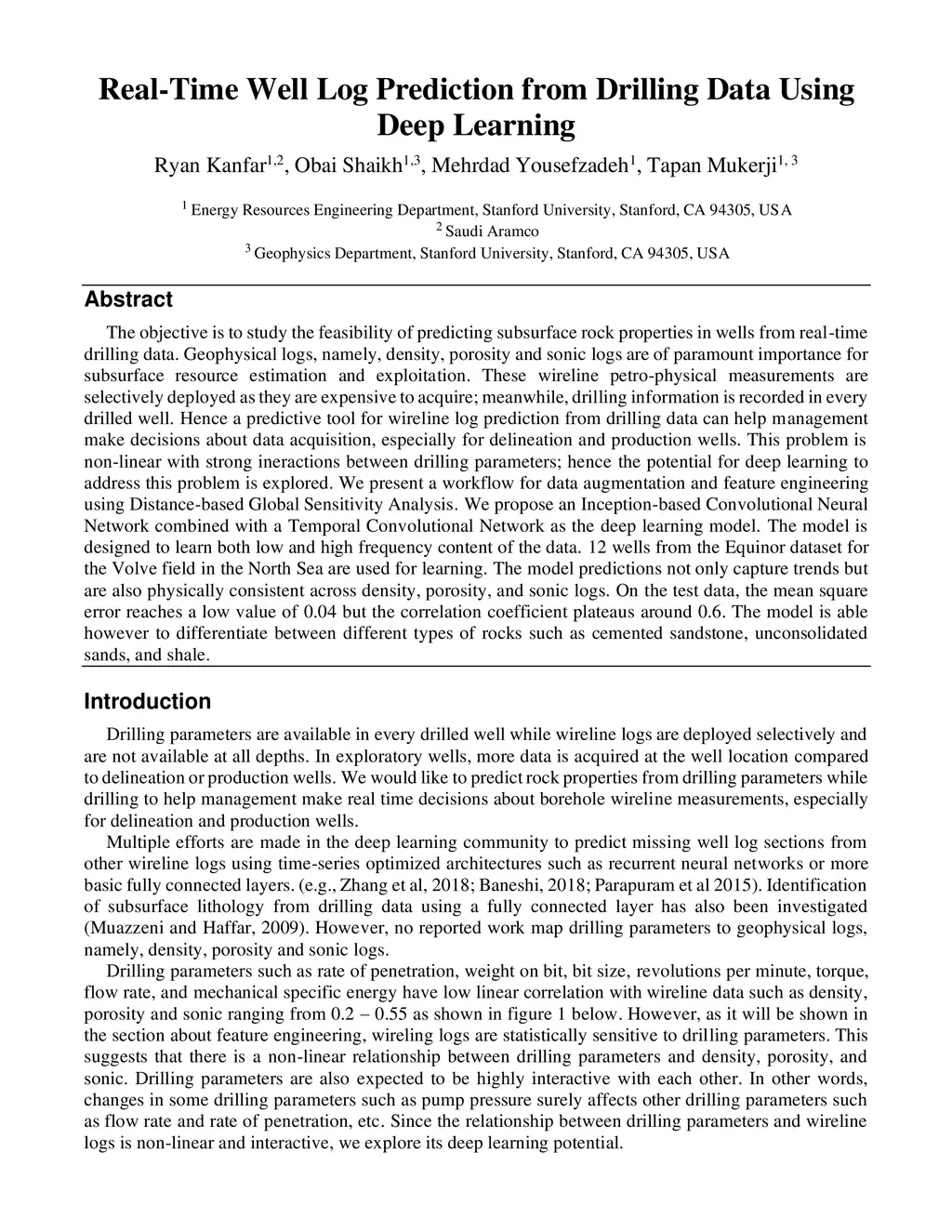 The objective is to study the feasibility of predicting subsurface rock properties in wells from real-time drilling data. Geophysical logs, namely, density, porosity and sonic logs are of paramount importance for subsurface resource estimation and exploitation. These wireline petro-physical measurements are selectively deployed as they are expensive to acquire; meanwhile, drilling information is recorded in every drilled well. Hence a predictive tool for wireline log prediction from drilling data can help management make decisions about data acquisition, especially for delineation and production wells. This problem is non-linear with strong ineractions between drilling parameters; hence the potential for deep learning to address this problem is explored. We present a workflow for data augmentation and feature engineering using Distance-based Global Sensitivity Analysis. We propose an Inception-based Convolutional Neural Network combined with a Temporal Convolutional Network as the deep learning model. The model is designed to learn both low and high frequency content of the data. 12 wells from the Equinor dataset for the Volve field in the North Sea are used for learning. The model predictions not only capture trends but are also physically consistent across density, porosity, and sonic logs. On the test data, the mean square error reaches a low value of 0.04 but the correlation coefficient plateaus around 0.6. The model is able however to differentiate between different types of rocks such as cemented sandstone, unconsolidated sands, and shale.