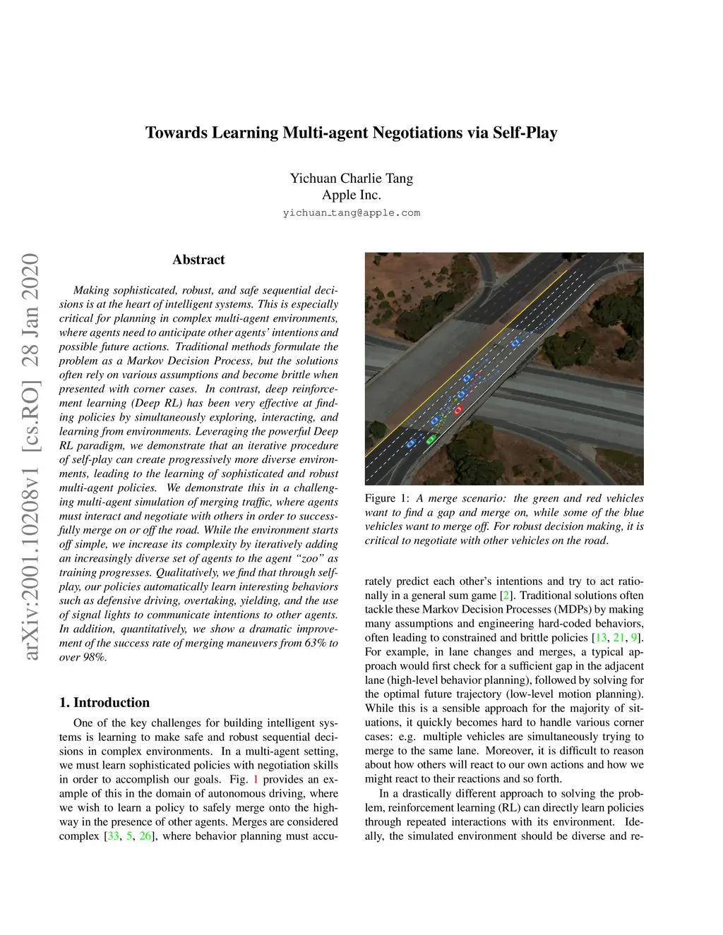 Making sophisticated, robust, and safe sequential decisions is at the heart of intelligent systems. This is especially critical for planning in complex multi-agent environments, where agents need to anticipate other agents' intentions and possible future actions. Traditional methods formulate the problem as a Markov Decision Process, but the solutions often rely on various assumptions and become brittle when presented with corner cases. In contrast, deep reinforcement learning (Deep RL) has been very effective at finding policies by simultaneously exploring, interacting, and learning from environments. Leveraging the powerful Deep RL paradigm, we demonstrate that an iterative procedure of self-play can create progressively more diverse environments, leading to the learning of sophisticated and robust multi-agent policies. We demonstrate this in a challenging multi-agent simulation of merging traffic, where agents must interact and negotiate with others in order to successfully merge on or off the road. While the environment starts off simple, we increase its complexity by iteratively adding an increasingly diverse set of agents to the agent "zoo" as training progresses. Qualitatively, we find that through self-play, our policies automatically learn interesting behaviors such as defensive driving, overtaking, yielding, and the use of signal lights to communicate intentions to other agents. In addition, quantitatively, we show a dramatic improvement of the success rate of merging maneuvers from 63% to over 98%.