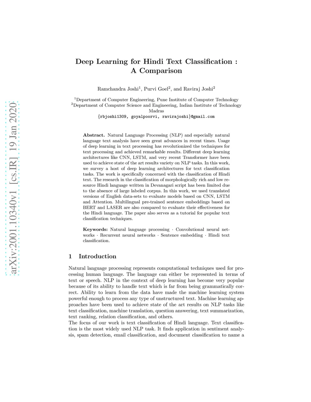 Natural Language Processing (NLP) and especially natural language text analysis have seen great advances in recent times. Usage of deep learning in text processing has revolutionized the techniques for text processing and achieved remarkable results. Different deep learning architectures like CNN, LSTM, and very recent Transformer have been used to achieve state of the art results variety on NLP tasks. In this work, we survey a host of deep learning architectures for text classification tasks. The work is specifically concerned with the classification of Hindi text. The research in the classification of morphologically rich and low resource Hindi language written in Devanagari script has been limited due to the absence of large labeled corpus. In this work, we used translated versions of English data-sets to evaluate models based on CNN, LSTM and Attention. Multilingual pre-trained sentence embeddings based on BERT and LASER are also compared to evaluate their effectiveness for the Hindi language. The paper also serves as a tutorial for popular text classification techniques.