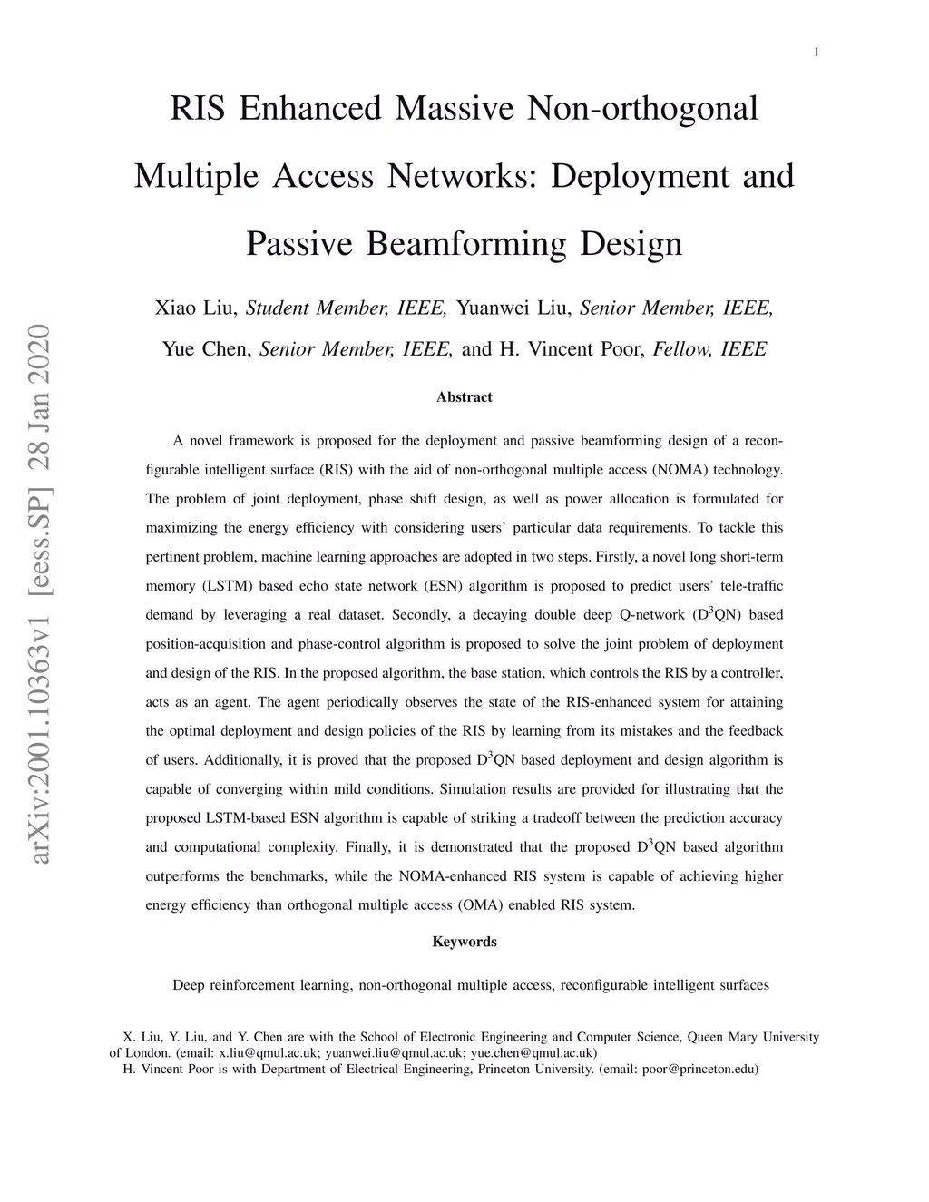 A novel framework is proposed for the deployment and passive beamforming design of a reconfigurable intelligent surface (RIS) with the aid of non-orthogonal multiple access (NOMA) technology. The problem of joint deployment, phase shift design, as well as power allocation is formulated for maximizing the energy efficiency with considering users' particular data requirements. To tackle this pertinent problem, machine learning approaches are adopted in two steps. Firstly, a novel long short-term memory (LSTM) based echo state network (ESN) algorithm is proposed to predict users' tele-traffic demand by leveraging a real dataset. Secondly, a decaying double deep Q-network (D3QN) based position-acquisition and phase-control algorithm is proposed to solve the joint problem of deployment and design of the RIS. In the proposed algorithm, the base station, which controls the RIS by a controller, acts as an agent. The agent periodically observes the state of the RIS-enhanced system for attaining the optimal deployment and design policies of the RIS by learning from its mistakes and the feedback of users. Additionally, it is proved that the proposed D3QN based deployment and design algorithm is capable of converging within mild conditions. Simulation results are provided for illustrating that the proposed LSTM-based ESN algorithm is capable of striking a tradeoff between the prediction accuracy and computational complexity. Finally, it is demonstrated that the proposed D3QN based algorithm outperforms the benchmarks, while the NOMA-enhanced RIS system is capable of achieving higher energy efficiency than orthogonal multiple access (OMA) enabled RIS system.