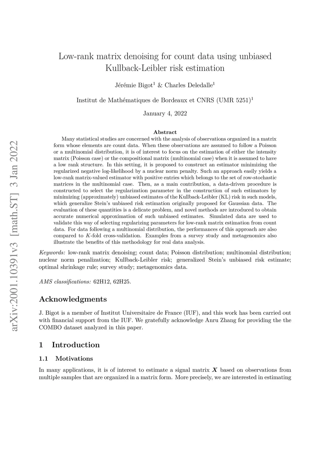 Many statistical studies are concerned with the analysis of observations organized in a matrix form whose elements are count data. When these observations are assumed to follow a Poisson or a multinomial distribution, it is of interest to focus on the estimation of either the intensity matrix (Poisson case) or the compositional matrix (multinomial case) when it is assumed to have a low rank structure. In this setting, it is proposed to construct an estimator minimizing the regularized negative log-likelihood by a nuclear norm penalty. Such an approach easily yields a low-rank matrix-valued estimator with positive entries which belongs to the set of row-stochastic matrices in the multinomial case. Then, as a main contribution, a data-driven procedure is constructed to select the regularization parameter in the construction of such estimators by minimizing (approximately) unbiased estimates of the Kullback-Leibler (KL) risk in such models, which generalize Stein's unbiased risk estimation originally proposed for Gaussian data. The evaluation of these quantities is a delicate problem, and novel methods are introduced to obtain accurate numerical approximation of such unbiased estimates. Simulated data are used to validate this way of selecting regularizing parameters for low-rank matrix estimation from count data. For data following a multinomial distribution, the performances of this approach are also compared to -fold cross-validation. Examples from a survey study and metagenomics also illustrate the benefits of this methodology for real data analysis.