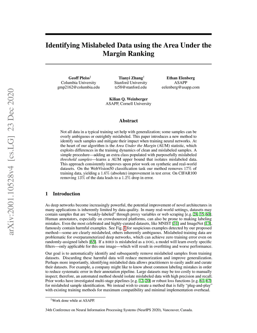 Identifying Mislabeled Data using the Area Under the Margin Ranking