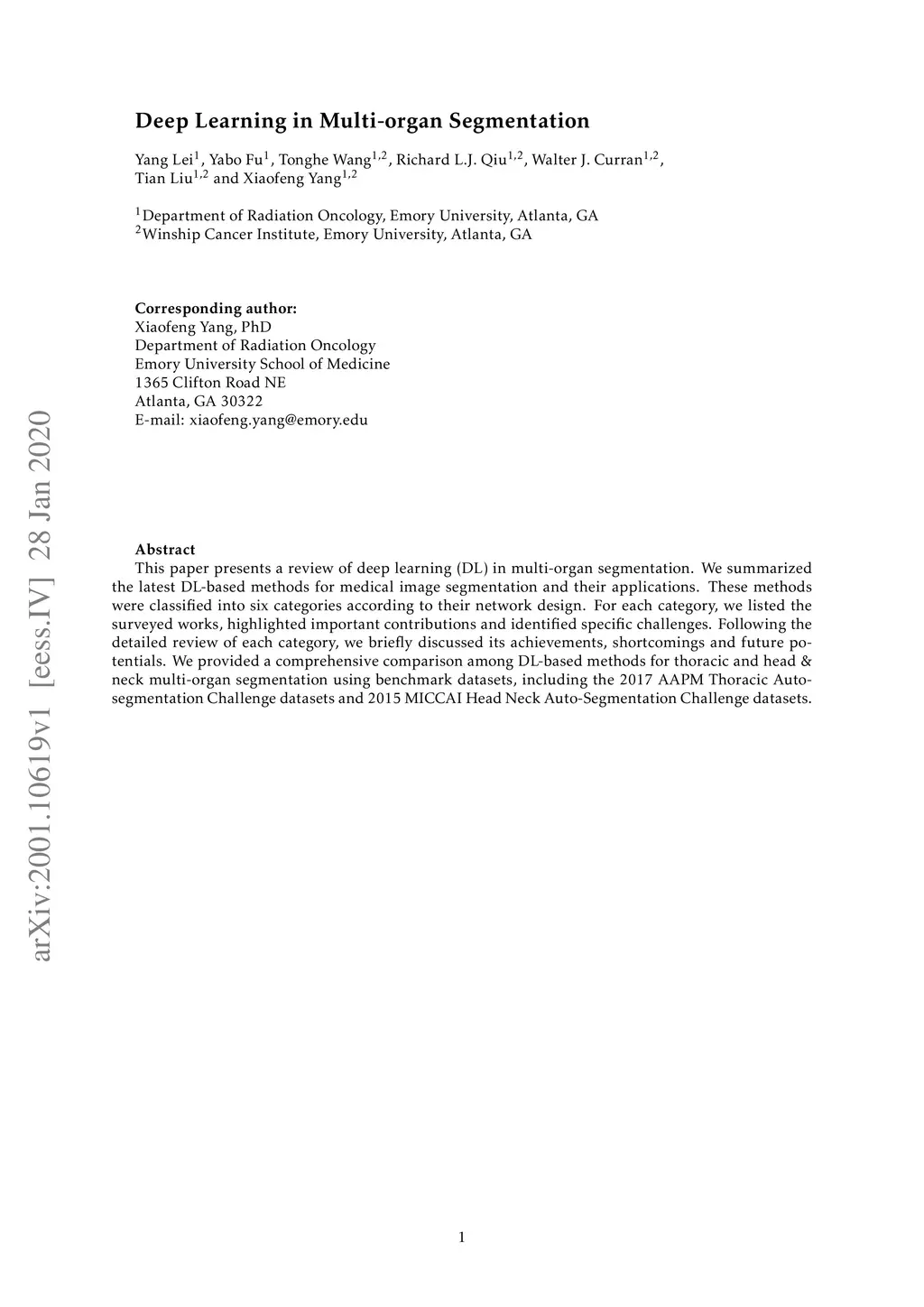 This paper presents a review of deep learning (DL) in multi-organ segmentation. We summarized the latest DL-based methods for medical image segmentation and applications. These methods were classified into six categories according to their network design. For each category, we listed the surveyed works, highlighted important contributions and identified specific challenges. Following the detailed review of each category, we briefly discussed its achievements, shortcomings and future potentials. We provided a comprehensive comparison among DL-based methods for thoracic and head & neck multiorgan segmentation using benchmark datasets, including the 2017 AAPM Thoracic Auto-segmentation Challenge datasets and 2015 MICCAI Head Neck Auto-Segmentation Challenge datasets.