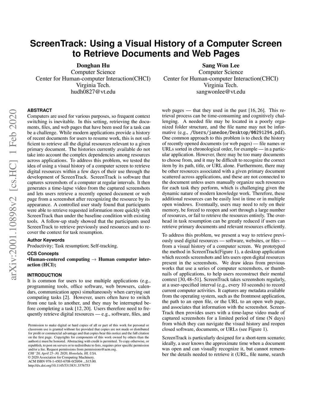 ScreenTrack: Using a Visual History of a Computer Screen to Retrieve