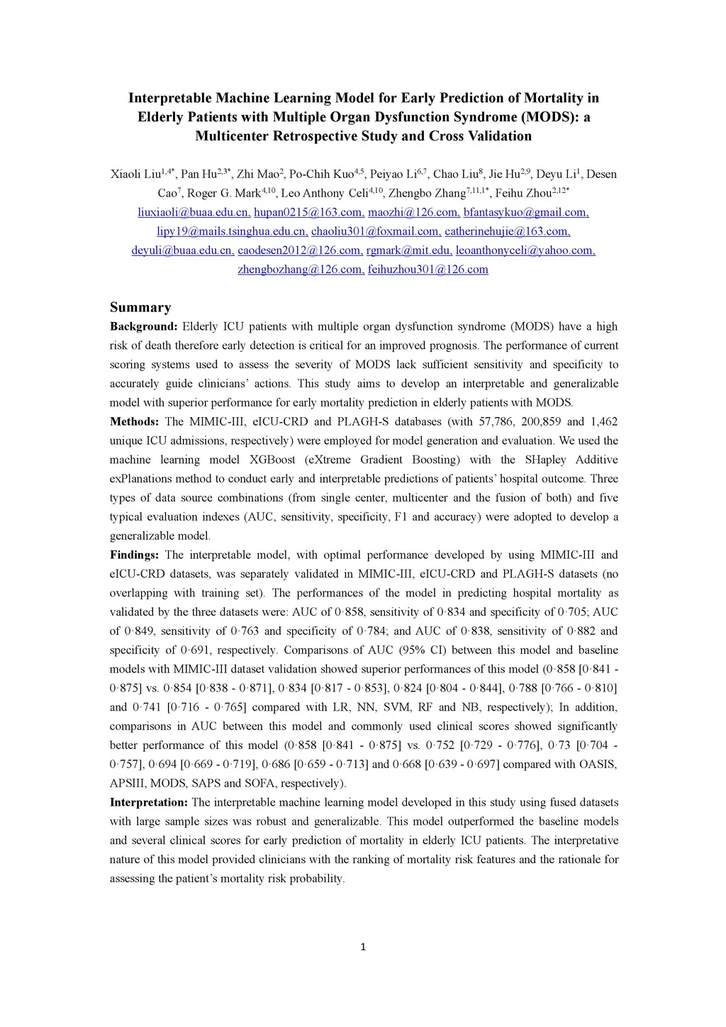 Background: Elderly patients with MODS have high risk of death and poor prognosis. The performance of current scoring systems assessing the severity of MODS and its mortality remains unsatisfactory. This study aims to develop an interpretable and generalizable model for early mortality prediction in elderly patients with MODS. Methods: The MIMIC-III, eICU-CRD and PLAGH-S databases were employed for model generation and evaluation. We used the eXtreme Gradient Boosting model with the SHapley Additive exPlanations method to conduct early and interpretable predictions of patients' hospital outcome. Three types of data source combinations and five typical evaluation indexes were adopted to develop a generalizable model. Findings: The interpretable model, with optimal performance developed by using MIMIC-III and eICU-CRD datasets, was separately validated in MIMIC-III, eICU-CRD and PLAGH-S datasets (no overlapping with training set). The performances of the model in predicting hospital mortality as validated by the three datasets were: AUC of 0.858, sensitivity of 0.834 and specificity of 0.705; AUC of 0.849, sensitivity of 0.763 and specificity of 0.784; and AUC of 0.838, sensitivity of 0.882 and specificity of 0.691, respectively. Comparisons of AUC between this model and baseline models with MIMIC-III dataset validation showed superior performances of this model; In addition, comparisons in AUC between this model and commonly used clinical scores showed significantly better performance of this model. Interpretation: The interpretable machine learning model developed in this study using fused datasets with large sample sizes was robust and generalizable. This model outperformed the baseline models and several clinical scores for early prediction of mortality in elderly ICU patients. The interpretative nature of this model provided clinicians with the ranking of mortality risk features.