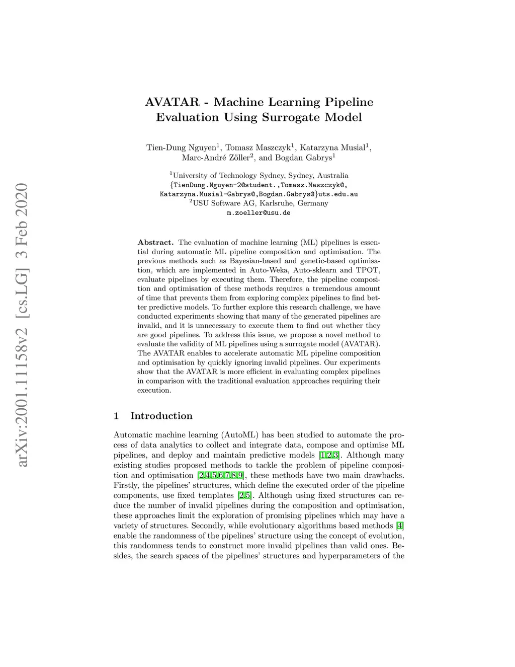 The evaluation of machine learning (ML) pipelines is essential during automatic ML pipeline composition and optimisation. The previous methods such as Bayesian-based and genetic-based optimisation, which are implemented in Auto-Weka, Auto-sklearn and TPOT, evaluate pipelines by executing them. Therefore, the pipeline composition and optimisation of these methods requires a tremendous amount of time that prevents them from exploring complex pipelines to find better predictive models. To further explore this research challenge, we have conducted experiments showing that many of the generated pipelines are invalid, and it is unnecessary to execute them to find out whether they are good pipelines. To address this issue, we propose a novel method to evaluate the validity of ML pipelines using a surrogate model (AVATAR). The AVATAR enables to accelerate automatic ML pipeline composition and optimisation by quickly ignoring invalid pipelines. Our experiments show that the AVATAR is more efficient in evaluating complex pipelines in comparison with the traditional evaluation approaches requiring their execution.