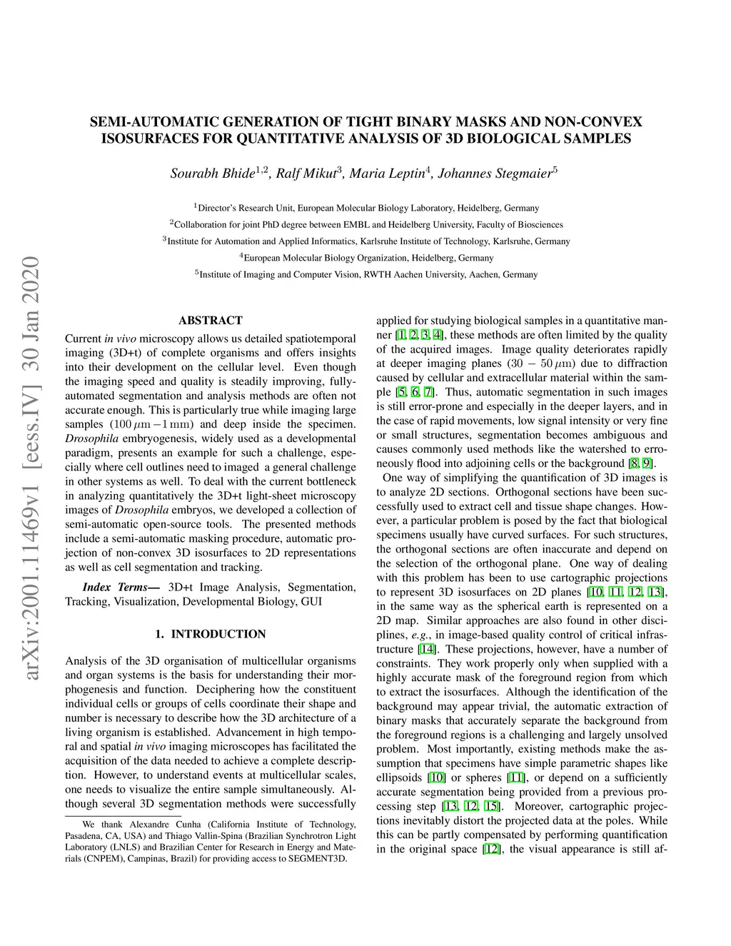 Current in vivo microscopy allows us detailed spatiotemporal imaging (3D+t) of complete organisms and offers insights into their development on the cellular level. Even though the imaging speed and quality is steadily improving, fully-automated segmentation and analysis methods are often not accurate enough. This is particularly true while imaging large samples (100um - 1mm) and deep inside the specimen. Drosophila embryogenesis, widely used as a developmental paradigm, presents an example for such a challenge, especially where cell outlines need to imaged - a general challenge in other systems as well. To deal with the current bottleneck in analyzing quantitatively the 3D+t light-sheet microscopy images of Drosophila embryos, we developed a collection of semi-automatic open-source tools. The presented methods include a semi-automatic masking procedure, automatic projection of non-convex 3D isosurfaces to 2D representations as well as cell segmentation and tracking.