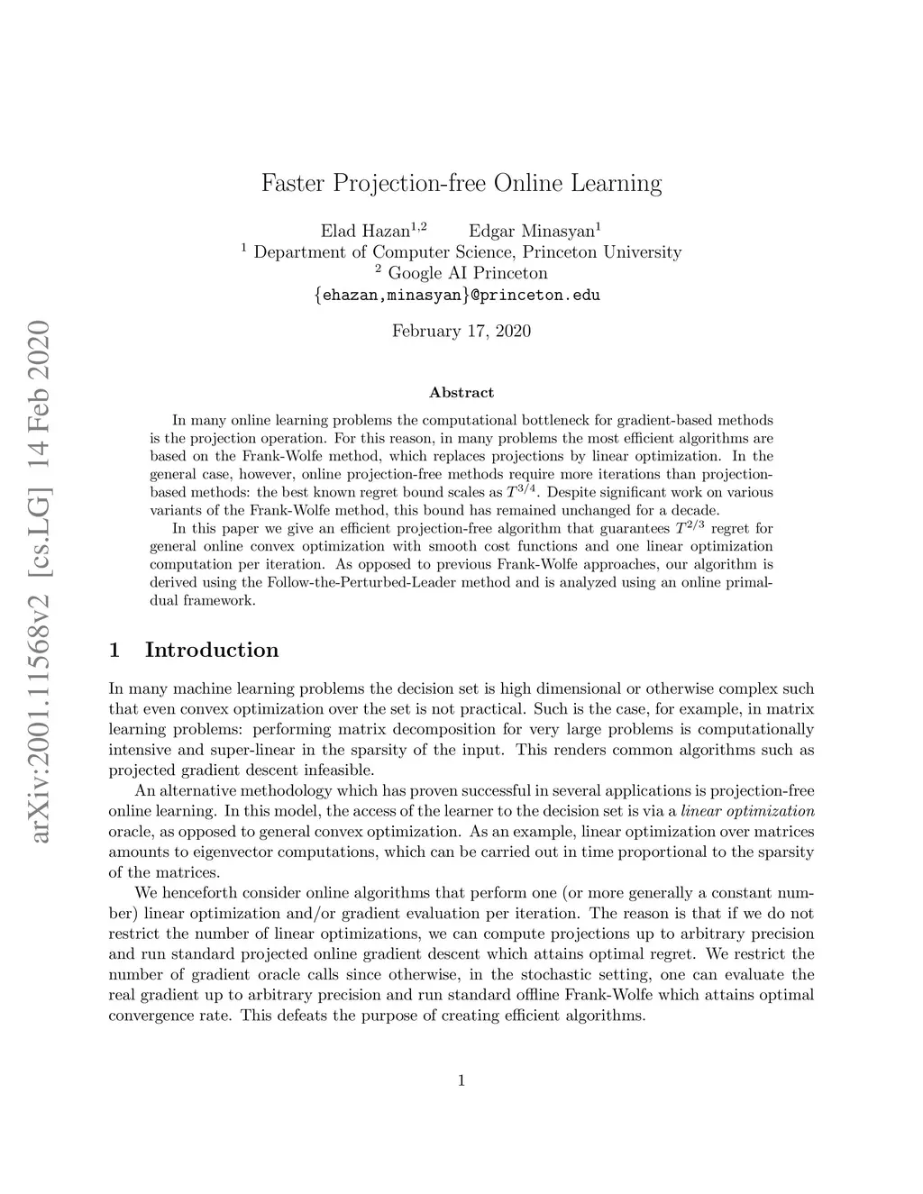 In many online learning problems the computational bottleneck for gradient-based methods is the projection operation. For this reason, in many problems the most efficient algorithms are based on the Frank-Wolfe method, which replaces projections by linear optimization. In the general case, however, online projection-free methods require more iterations than projection-based methods: the best known regret bound scales as . Despite significant work on various variants of the Frank-Wolfe method, this bound has remained unchanged for a decade. In this paper we give an efficient projection-free algorithm that guarantees regret for general online convex optimization with smooth cost functions and one linear optimization computation per iteration. As opposed to previous Frank-Wolfe approaches, our algorithm is derived using the Follow-the-Perturbed-Leader method and is analyzed using an online primal-dual framework.