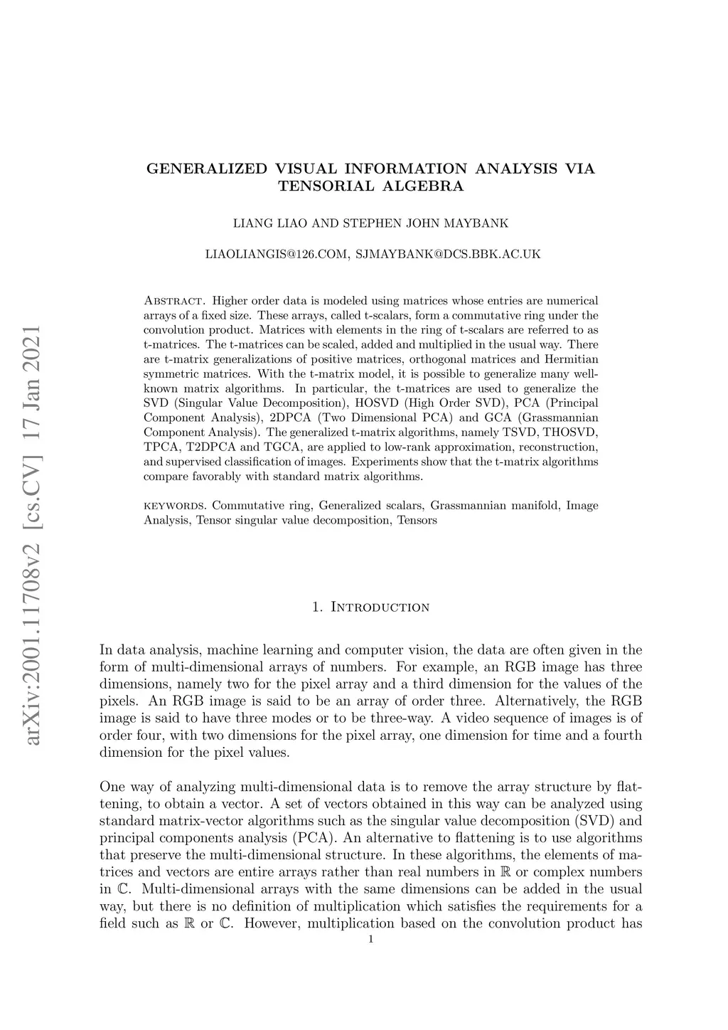 Higher order data is modeled using matrices whose entries are numerical arrays of a fixed size. These arrays, called t-scalars, form a commutative ring under the convolution product. Matrices with elements in the ring of t-scalars are referred to as t-matrices. The t-matrices can be scaled, added and multiplied in the usual way. There are t-matrix generalizations of positive matrices, orthogonal matrices and Hermitian symmetric matrices. With the t-matrix model, it is possible to generalize many well-known matrix algorithms. In particular, the t-matrices are used to generalize the SVD (Singular Value Decomposition), HOSVD (High Order SVD), PCA (Principal Component Analysis), 2DPCA (Two Dimensional PCA) and GCA (Grassmannian Component Analysis). The generalized t-matrix algorithms, namely TSVD, THOSVD,TPCA, T2DPCA and TGCA, are applied to low-rank approximation, reconstruction,and supervised classification of images. Experiments show that the t-matrix algorithms compare favorably with standard matrix algorithms.