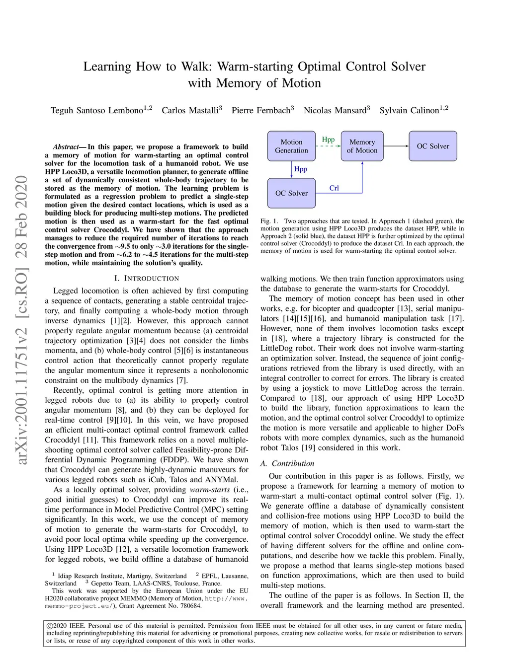 In this paper, we propose a framework to build a memory of motion for warm-starting an optimal control solver for the locomotion task of a humanoid robot. We use HPP Loco3D, a versatile locomotion planner, to generate offline a set of dynamically consistent whole-body trajectory to be stored as the memory of motion. The learning problem is formulated as a regression problem to predict a single-step motion given the desired contact locations, which is used as a building block for producing multi-step motions. The predicted motion is then used as a warm-start for the fast optimal control solver Crocoddyl. We have shown that the approach manages to reduce the required number of iterations to reach the convergence from 9.5 to only 3.0 iterations for the single-step motion and from 6.2 to 4.5 iterations for the multi-step motion, while maintaining the solution's quality.