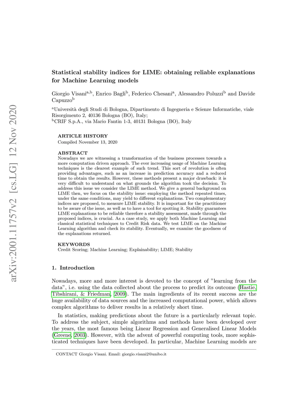 Nowadays we are witnessing a transformation of the business processes towards a more computation driven approach. The ever increasing usage of Machine Learning techniques is the clearest example of such trend. This sort of revolution is often providing advantages, such as an increase in prediction accuracy and a reduced time to obtain the results. However, these methods present a major drawback: it is very difficult to understand on what grounds the algorithm took the decision. To address this issue we consider the LIME method. We give a general background on LIME then, we focus on the stability issue: employing the method repeated times, under the same conditions, may yield to different explanations. Two complementary indices are proposed, to measure LIME stability. It is important for the practitioner to be aware of the issue, as well as to have a tool for spotting it. Stability guarantees LIME explanations to be reliable, therefore a stability assessment, made through the proposed indices, is crucial. As a case study, we apply both Machine Learning and classical statistical techniques to Credit Risk data. We test LIME on the Machine Learning algorithm and check its stability. Eventually, we examine the goodness of the explanations returned.