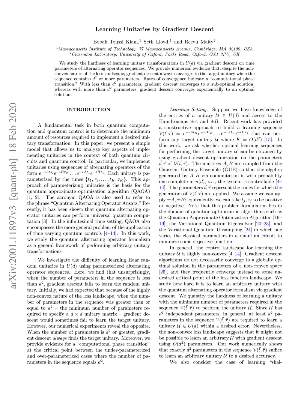 We study the hardness of learning unitary transformations in via gradient descent on time parameters of alternating operator sequences. We provide numerical evidence that, despite the non-convex nature of the loss landscape, gradient descent always converges to the target unitary when the sequence contains or more parameters. Rates of convergence indicate a "computational phase transition." With less than parameters, gradient descent converges to a sub-optimal solution, whereas with more than parameters, gradient descent converges exponentially to an optimal solution.