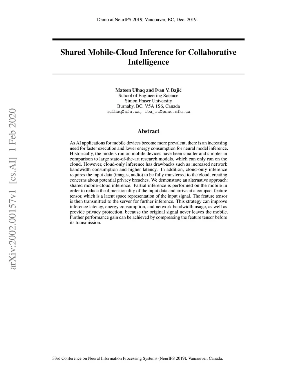 As AI applications for mobile devices become more prevalent, there is an increasing need for faster execution and lower energy consumption for neural model inference. Historically, the models run on mobile devices have been smaller and simpler in comparison to large state-of-the-art research models, which can only run on the cloud. However, cloud-only inference has drawbacks such as increased network bandwidth consumption and higher latency. In addition, cloud-only inference requires the input data (images, audio) to be fully transferred to the cloud, creating concerns about potential privacy breaches. We demonstrate an alternative approach: shared mobile-cloud inference. Partial inference is performed on the mobile in order to reduce the dimensionality of the input data and arrive at a compact feature tensor, which is a latent space representation of the input signal. The feature tensor is then transmitted to the server for further inference. This strategy can improve inference latency, energy consumption, and network bandwidth usage, as well as provide privacy protection, because the original signal never leaves the mobile. Further performance gain can be achieved by compressing the feature tensor before its transmission.