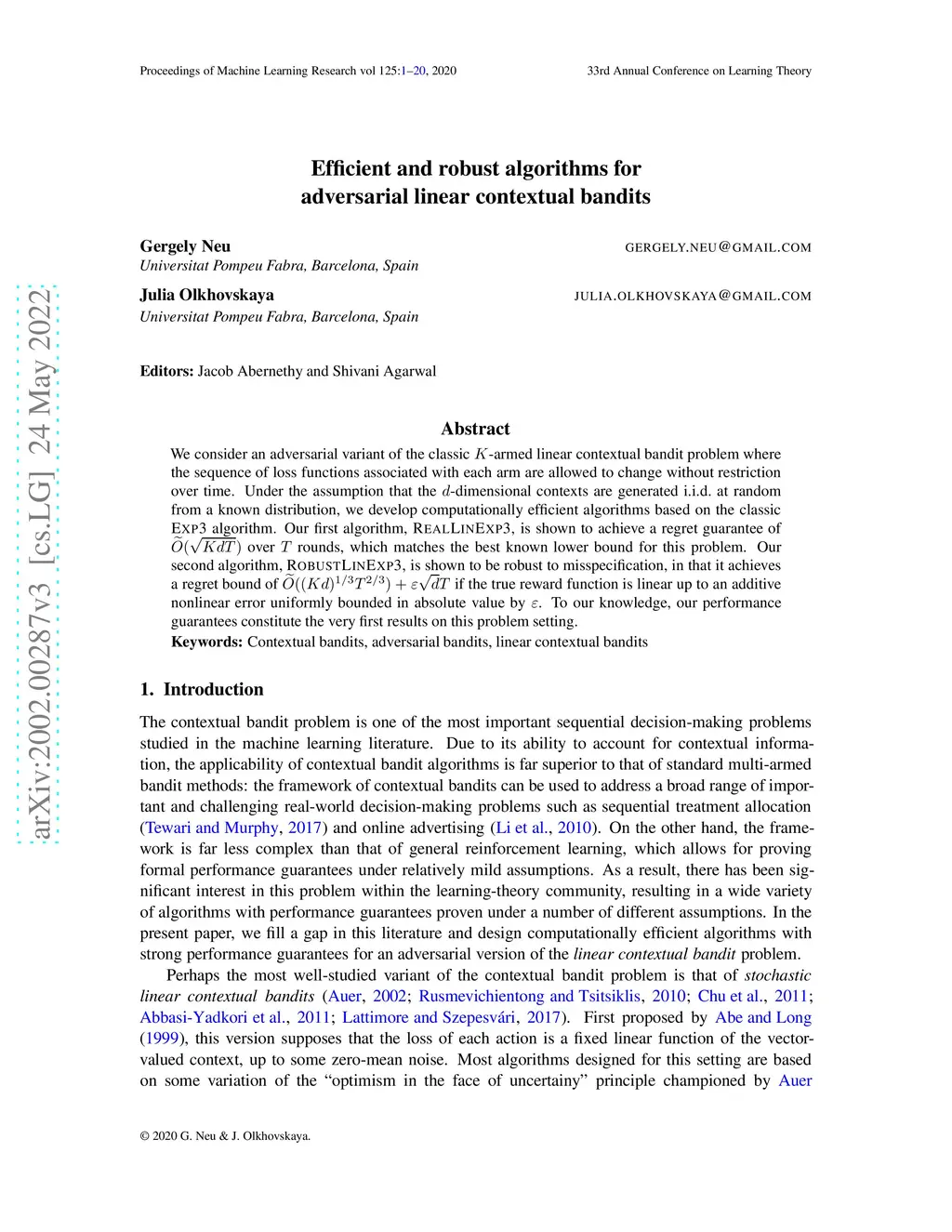 We consider an adversarial variant of the classic -armed linear contextual bandit problem where the sequence of loss functions associated with each arm are allowed to change without restriction over time. Under the assumption that the -dimensional contexts are generated i.i.d.~at random from a known distributions, we develop computationally efficient algorithms based on the classic Exp3 algorithm. Our first algorithm, RealLinExp3, is shown to achieve a regret guarantee of over rounds, which matches the best available bound for this problem. Our second algorithm, RobustLinExp3, is shown to be robust to misspecification, in that it achieves a regret bound of if the true reward function is linear up to an additive nonlinear error uniformly bounded in absolute value by . To our knowledge, our performance guarantees constitute the very first results on this problem setting.