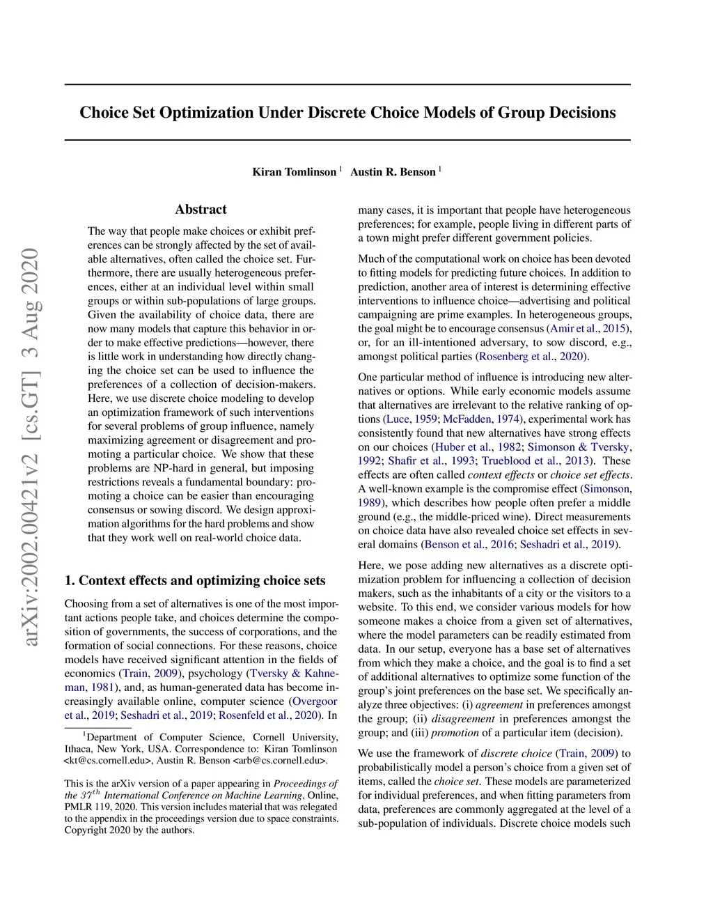 Choice Set Optimization Under Discrete Choice Models of Group Decisions