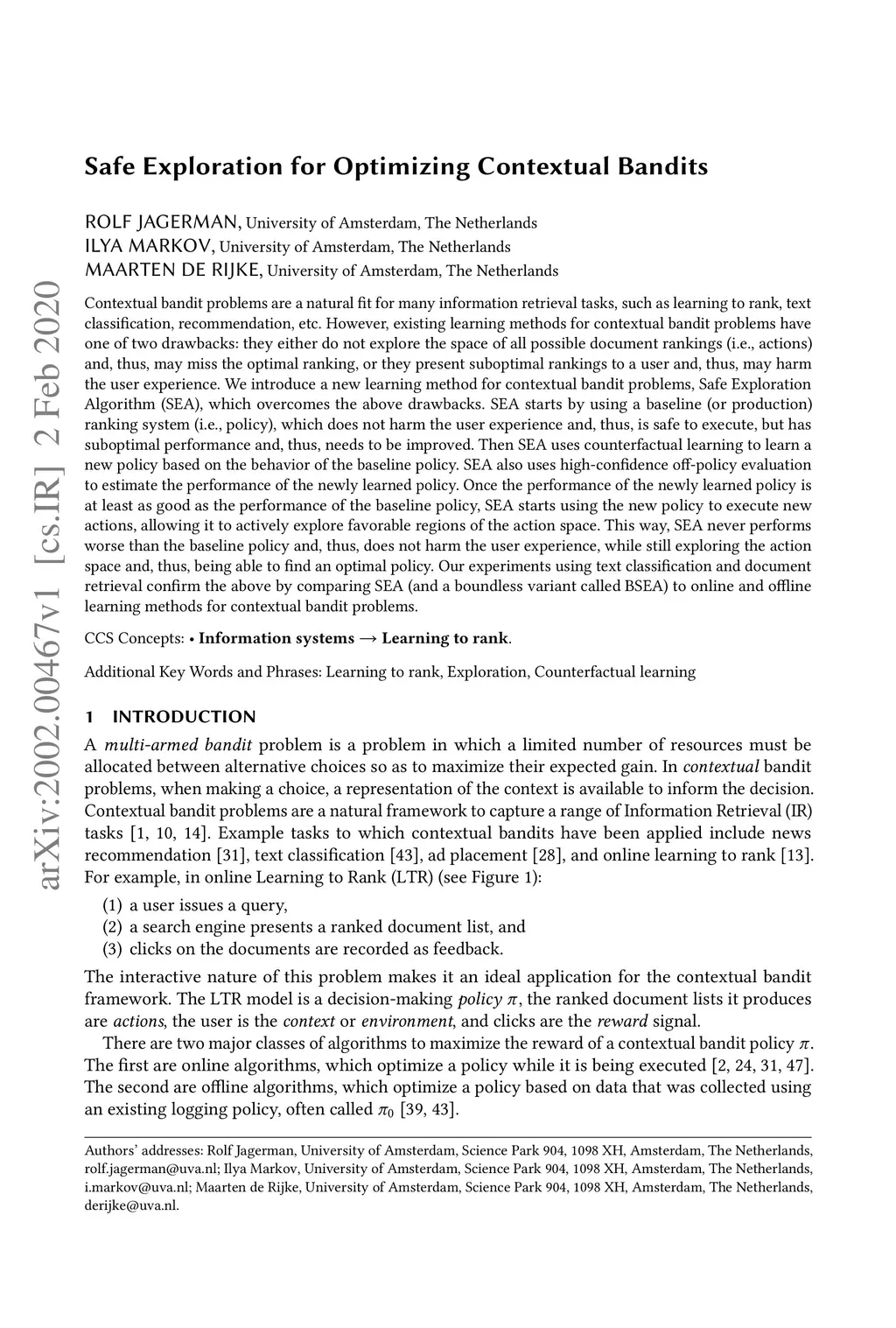 Contextual bandit problems are a natural fit for many information retrieval tasks, such as learning to rank, text classification, recommendation, etc. However, existing learning methods for contextual bandit problems have one of two drawbacks: they either do not explore the space of all possible document rankings (i.e., actions) and, thus, may miss the optimal ranking, or they present suboptimal rankings to a user and, thus, may harm the user experience. We introduce a new learning method for contextual bandit problems, Safe Exploration Algorithm (SEA), which overcomes the above drawbacks. SEA starts by using a baseline (or production) ranking system (i.e., policy), which does not harm the user experience and, thus, is safe to execute, but has suboptimal performance and, thus, needs to be improved. Then SEA uses counterfactual learning to learn a new policy based on the behavior of the baseline policy. SEA also uses high-confidence off-policy evaluation to estimate the performance of the newly learned policy. Once the performance of the newly learned policy is at least as good as the performance of the baseline policy, SEA starts using the new policy to execute new actions, allowing it to actively explore favorable regions of the action space. This way, SEA never performs worse than the baseline policy and, thus, does not harm the user experience, while still exploring the action space and, thus, being able to find an optimal policy. Our experiments using text classification and document retrieval confirm the above by comparing SEA (and a boundless variant called BSEA) to online and offline learning methods for contextual bandit problems.